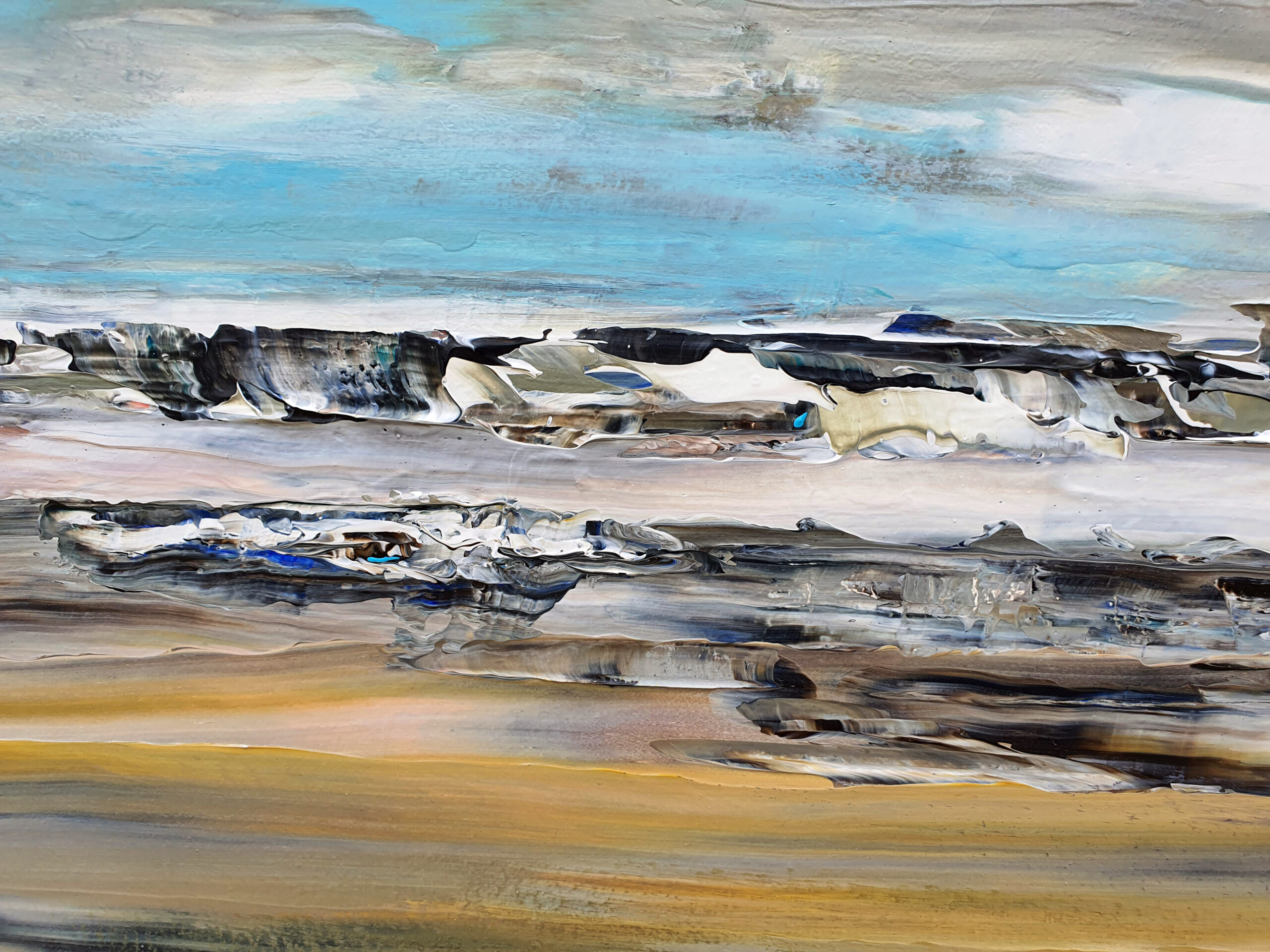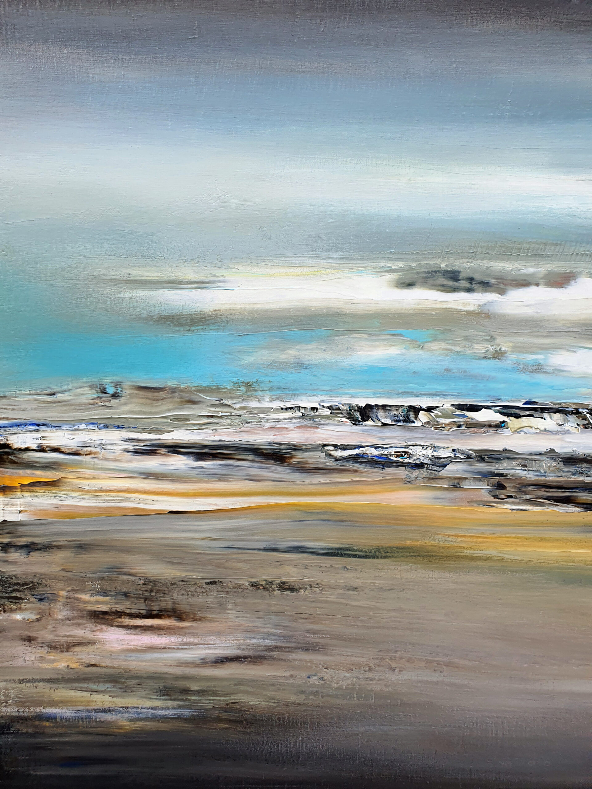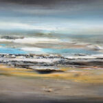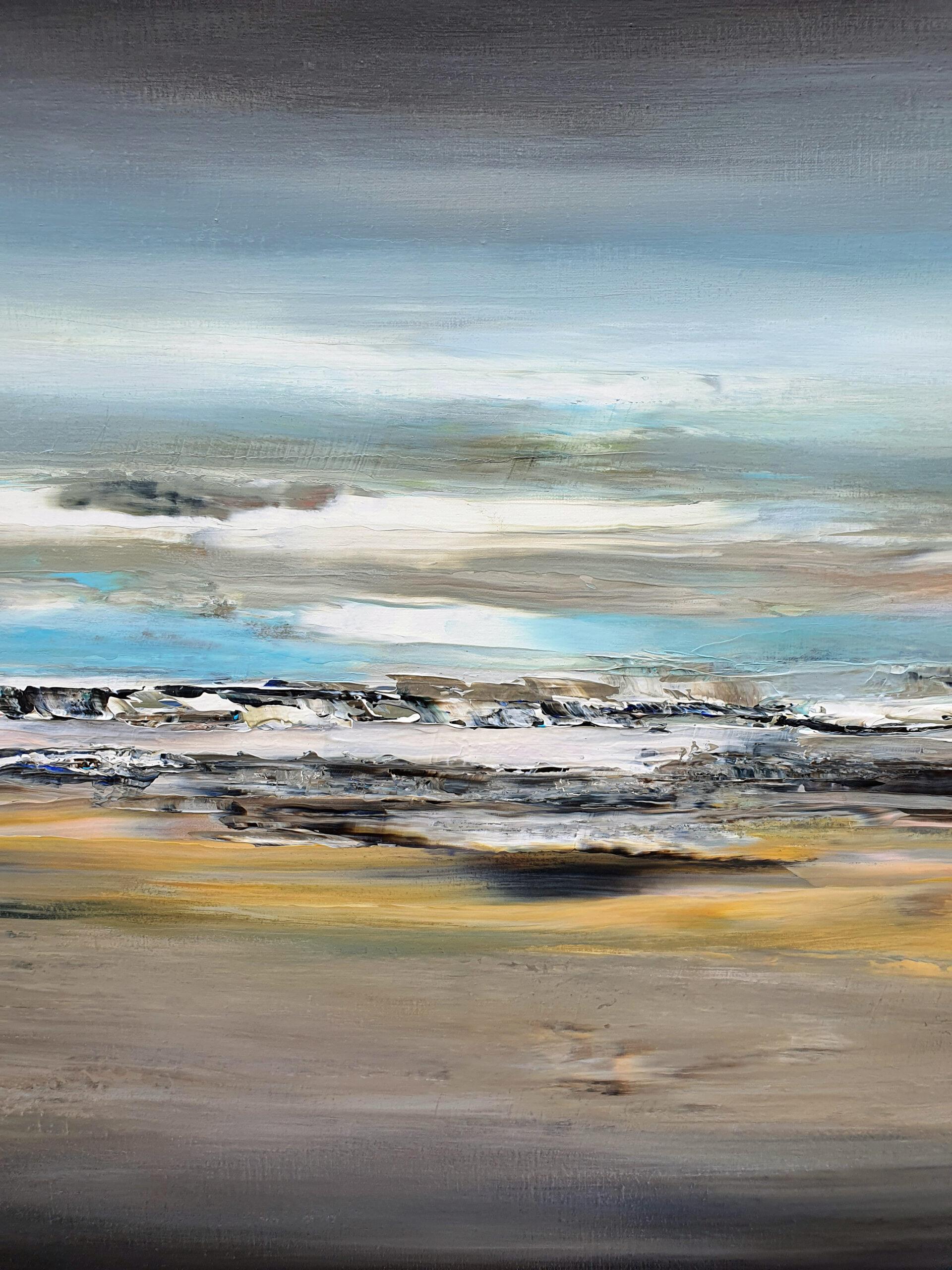 J’ai pensé la toile comme une mosaïque de sensations éphémères. Une lueur qui s’attarde, un orage qui s’efface, l’imminence du crépuscule : au-delà de la simple ligne d’horizon, « Fragments du jour » offre une succession de strates temporelles. Celles-ci sont faites de contrastes, de heurts entre la douceur de l’ocre et la profondeur du gris charbon. On retrouve aussi ces moments fugaces où la lumière du soleil tente de percer à travers la masse nuageuse. Comme des phares d’espoir au sein de la mélancolie de ce paysage sauvage.