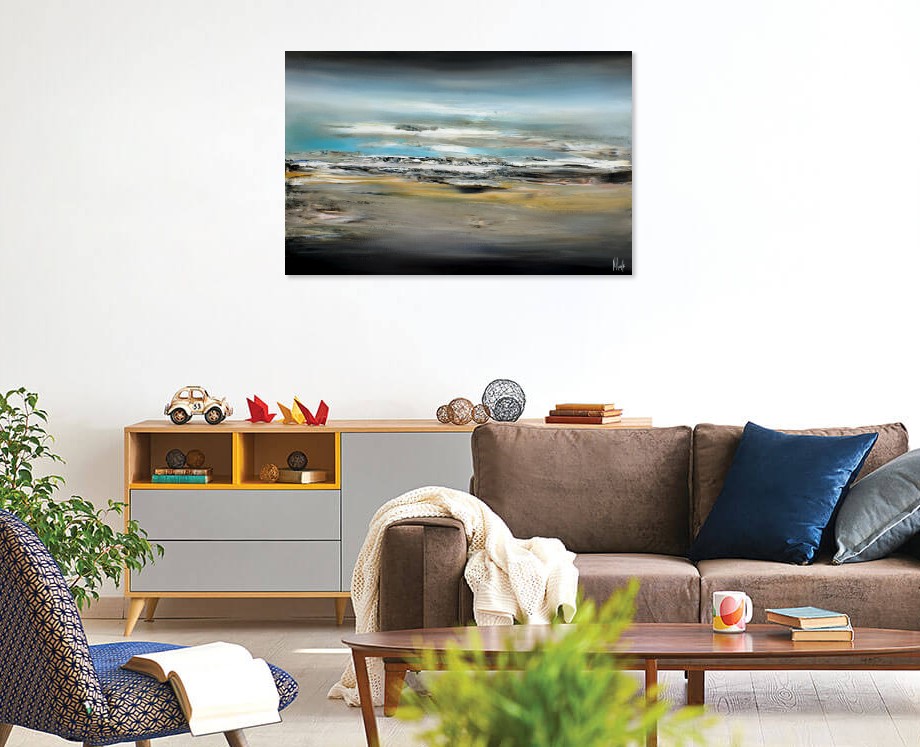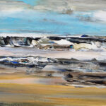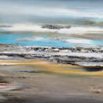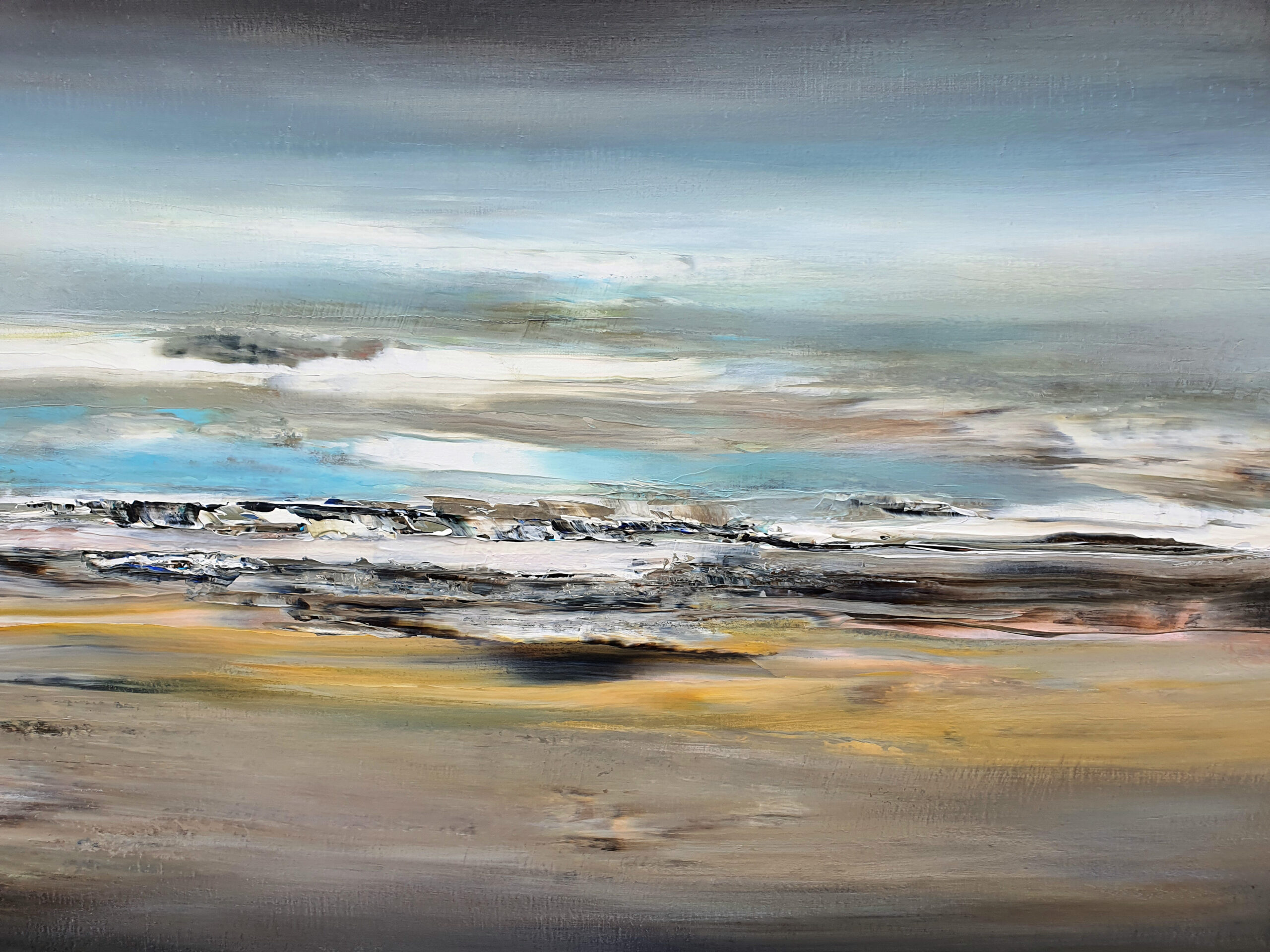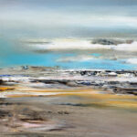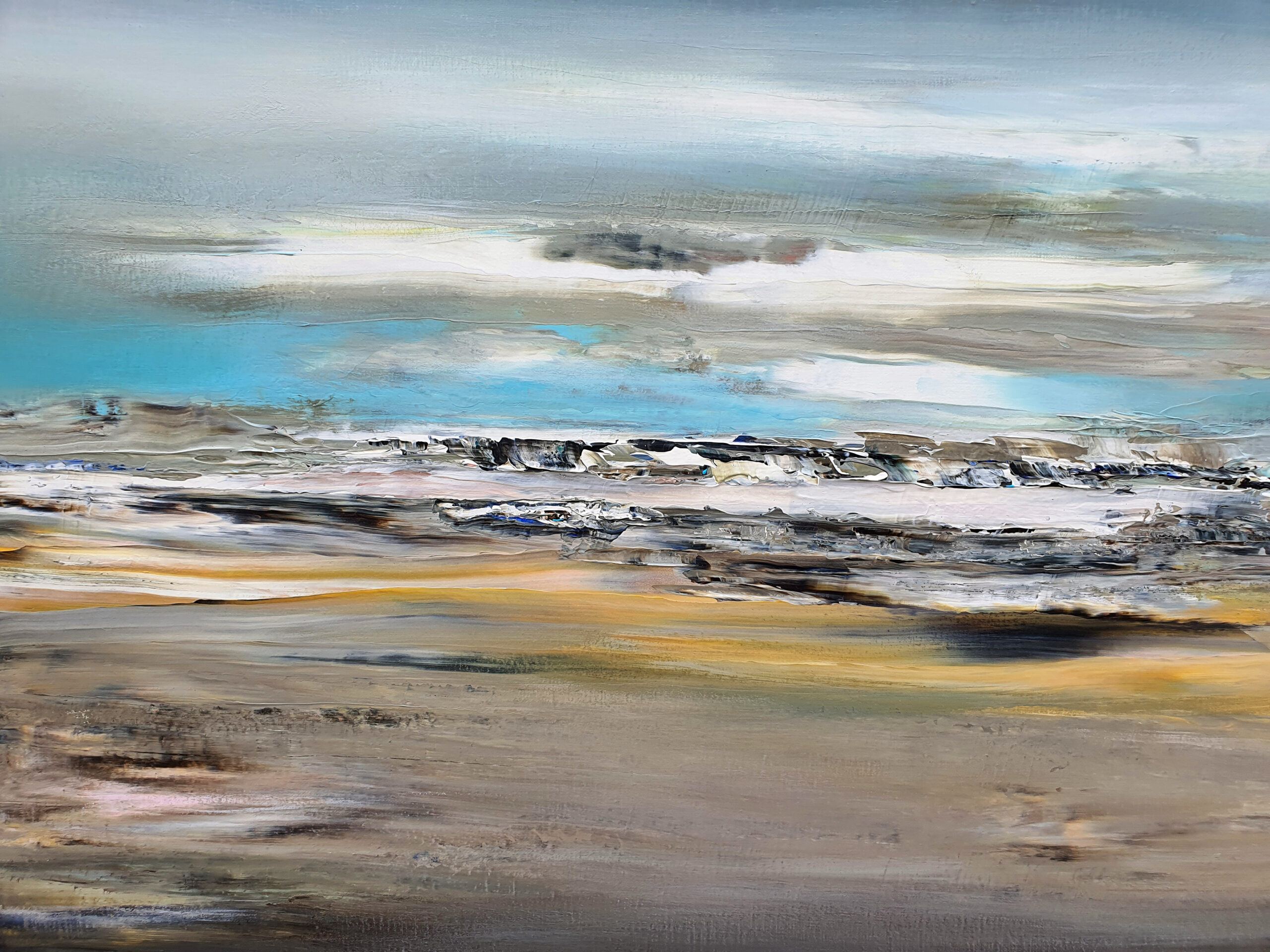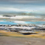 J’ai pensé la toile comme une mosaïque de sensations éphémères. Une lueur qui s’attarde, un orage qui s’efface, l’imminence du crépuscule : au-delà de la simple ligne d’horizon, « Fragments du jour » offre une succession de strates temporelles. Celles-ci sont faites de contrastes, de heurts entre la douceur de l’ocre et la profondeur du gris charbon. On retrouve aussi ces moments fugaces où la lumière du soleil tente de percer à travers la masse nuageuse. Comme des phares d’espoir au sein de la mélancolie de ce paysage sauvage.