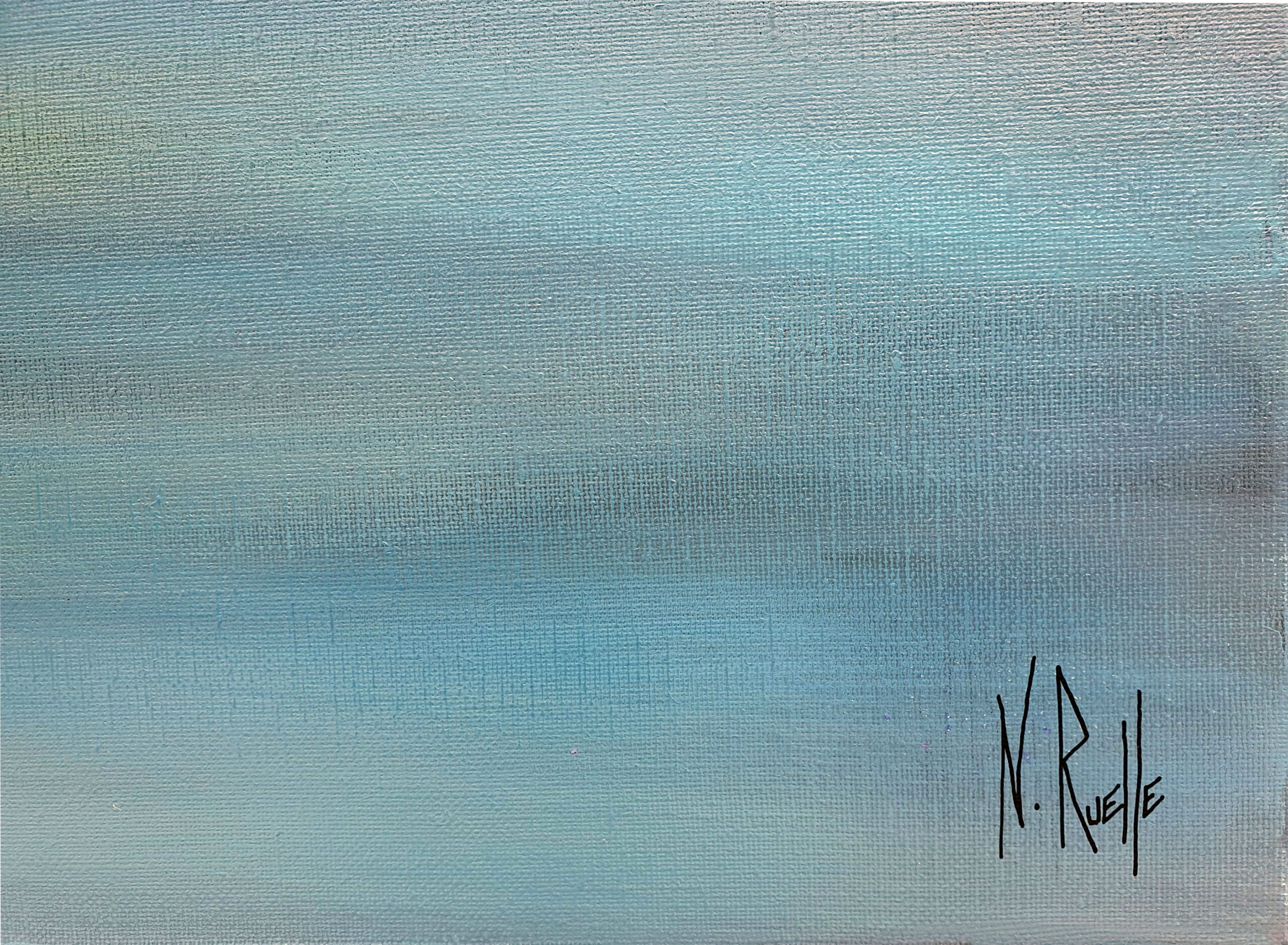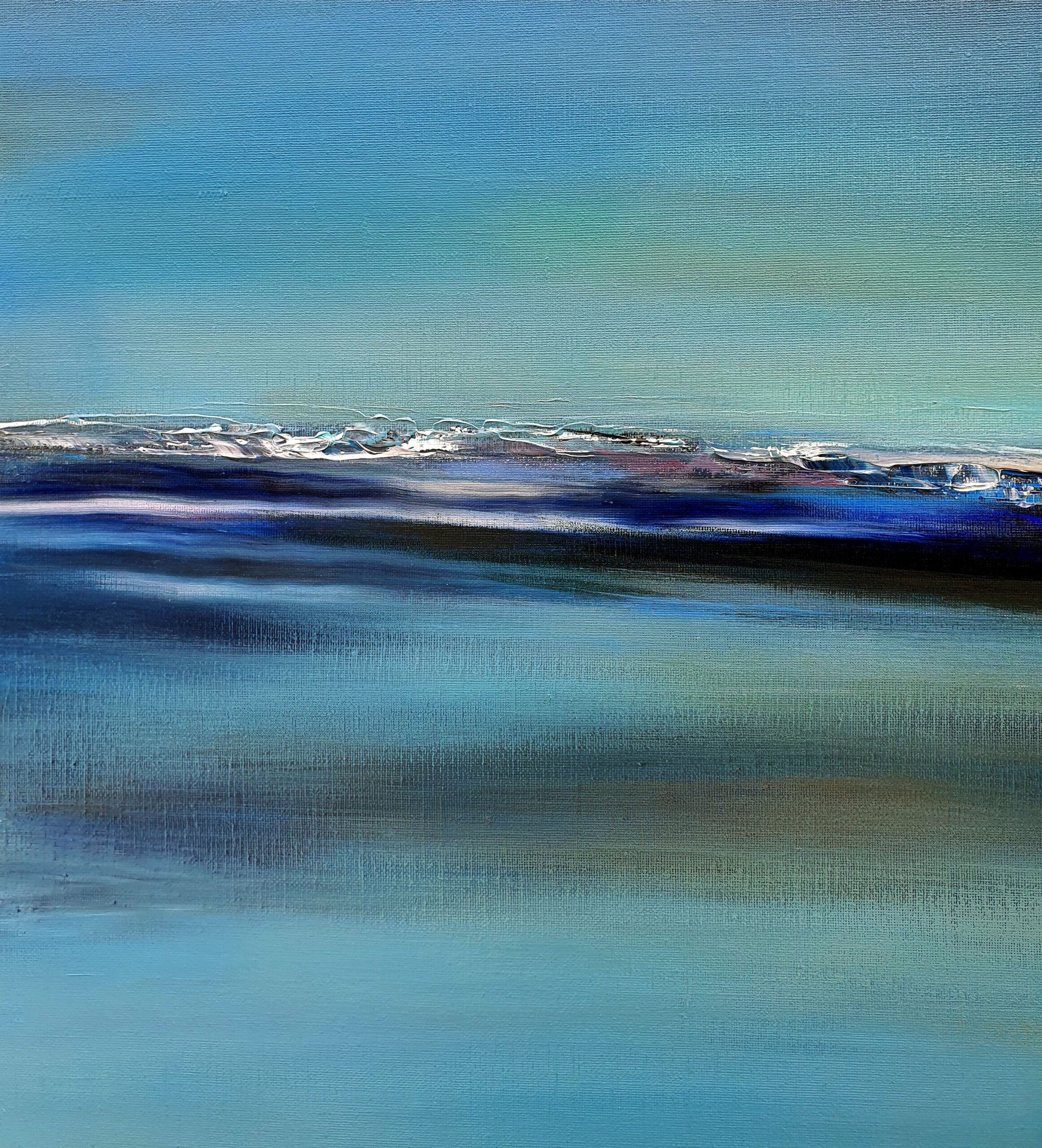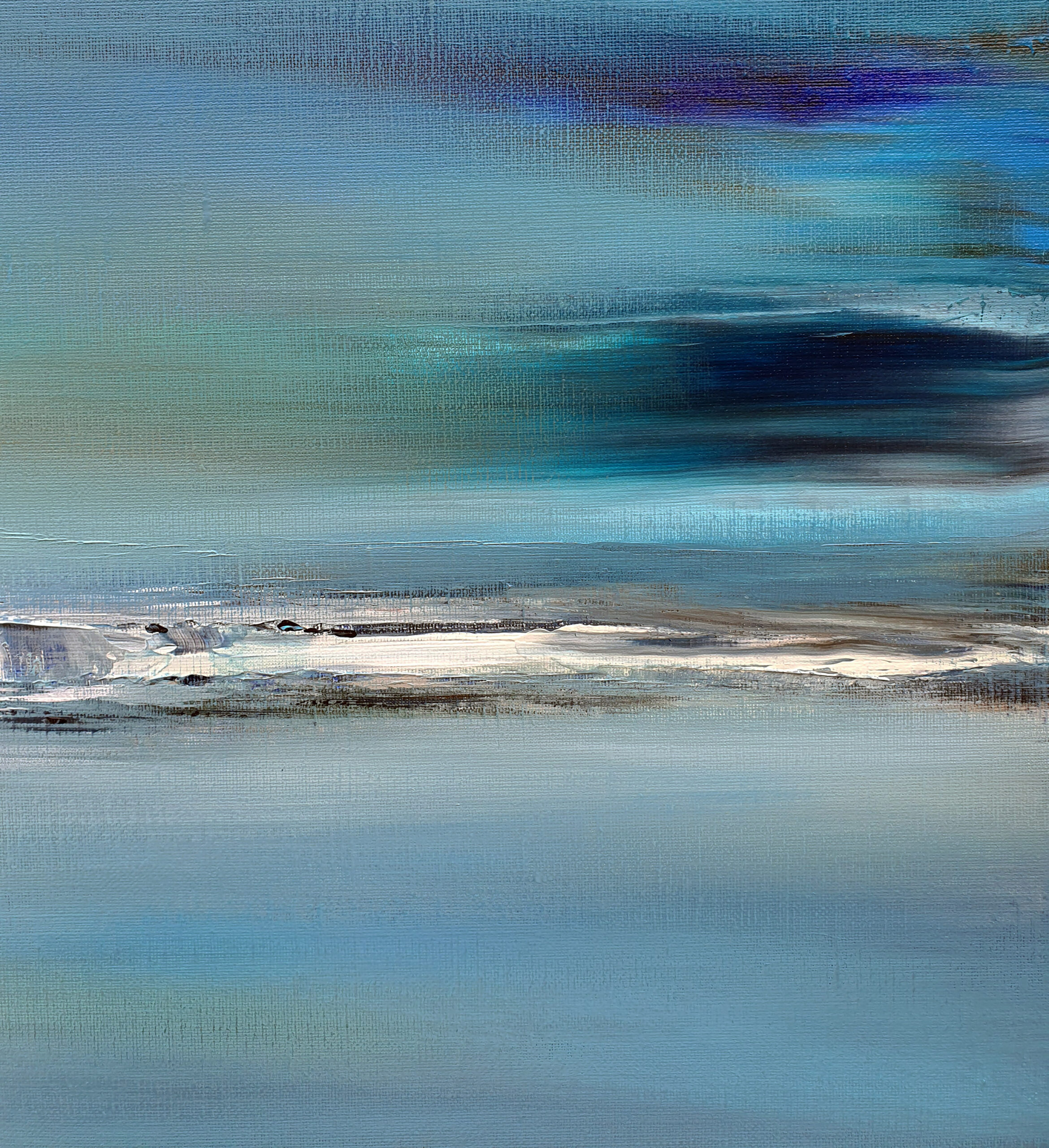 « Le bleu de la nuit » est une immersion sensorielle dans l’immensité nocturne. Pour cette toile, ma technique allie fluidité et matière. Le champ chromatique est dominé par des bleus profonds et changeants, du cyan lumineux jusqu’au bleu intense saturé de reflets verts. Les couleurs évoquent l’atmosphère dense et liquide d’une nuit sans fin.