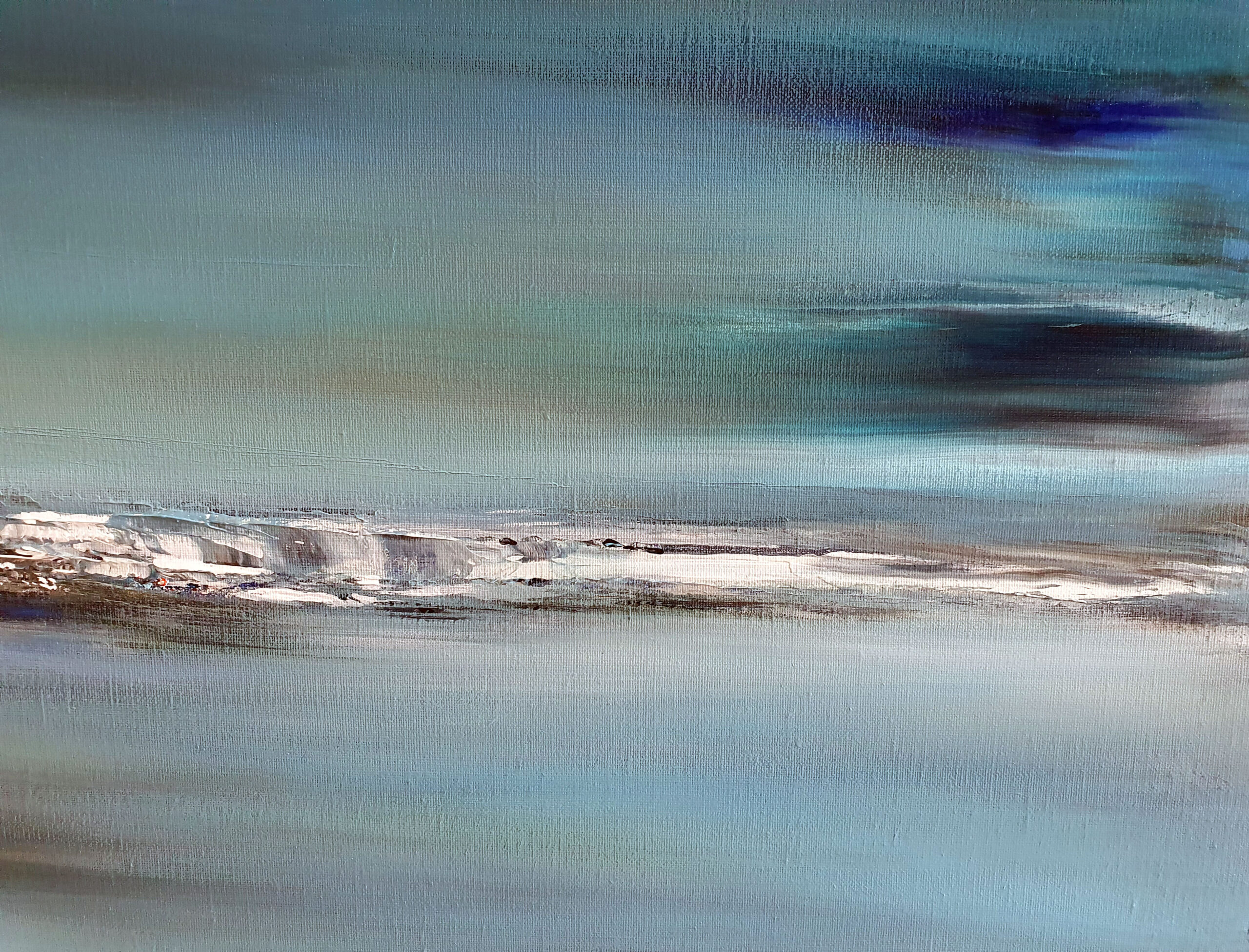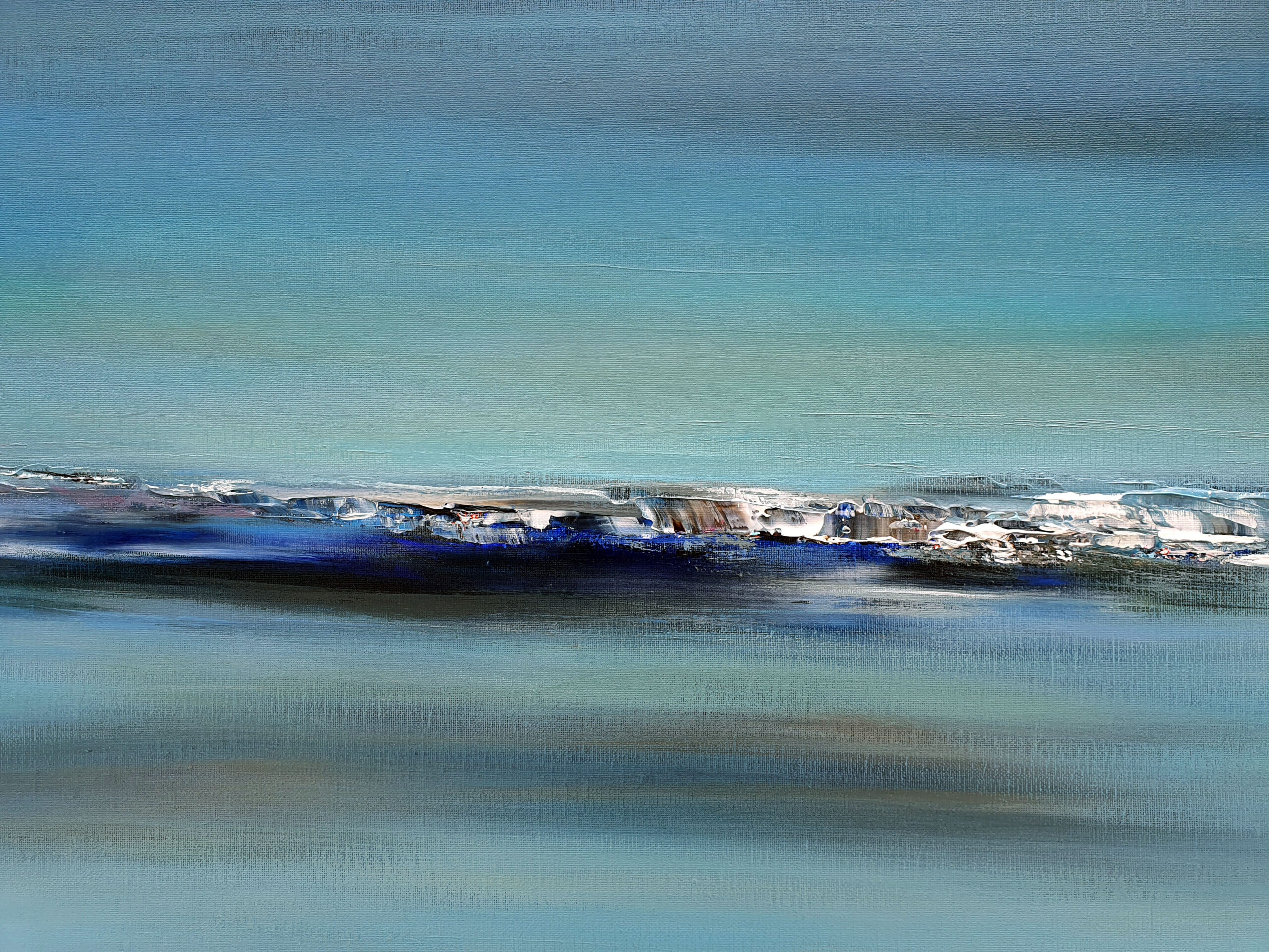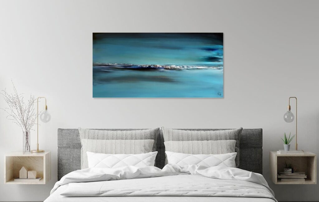 « Le bleu de la nuit » est une immersion sensorielle dans l’immensité nocturne. Pour cette toile, ma technique allie fluidité et matière. Le champ chromatique est dominé par des bleus profonds et changeants, du cyan lumineux jusqu’au bleu intense saturé de reflets verts. Les couleurs évoquent l’atmosphère dense et liquide d’une nuit sans fin.