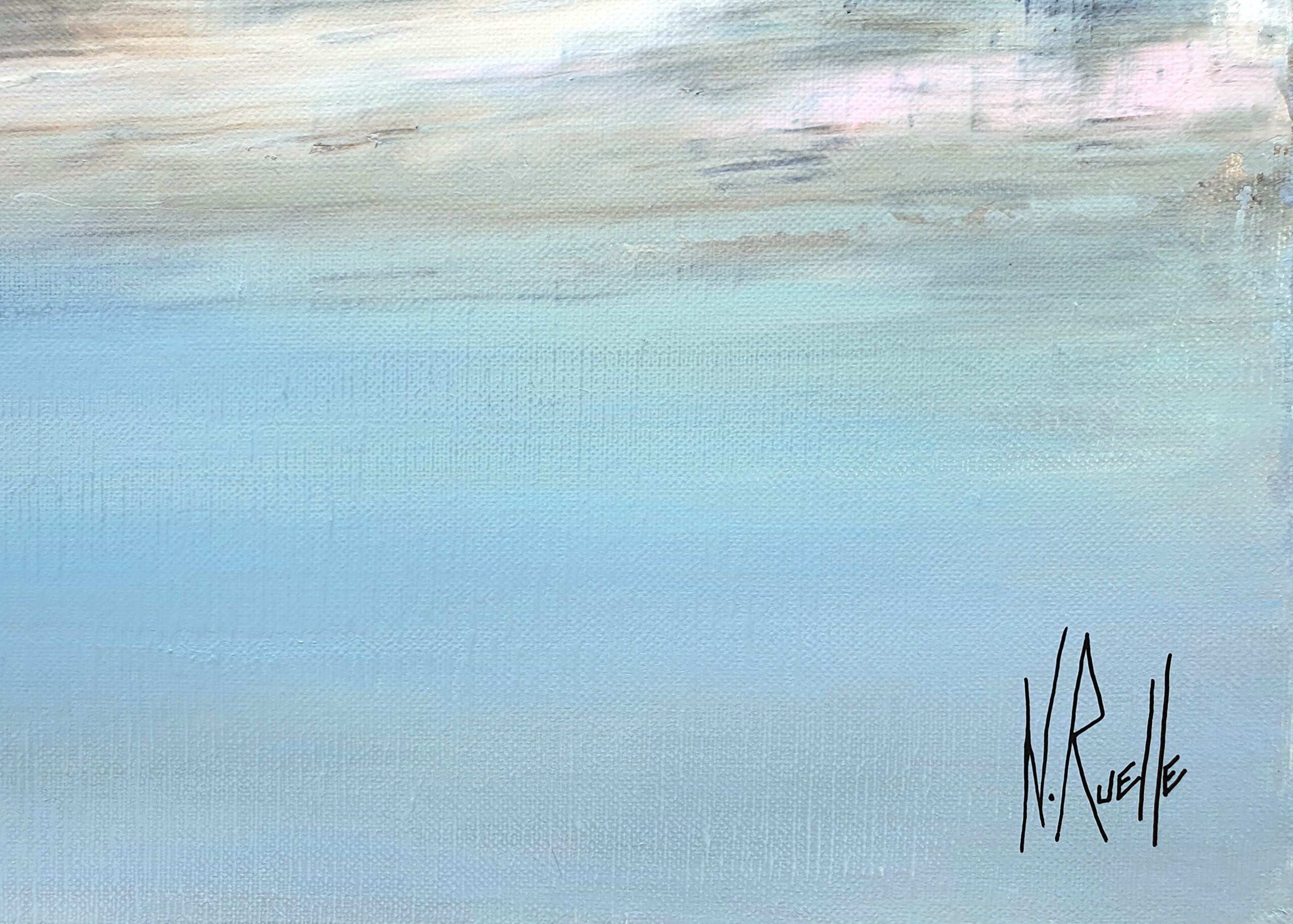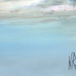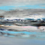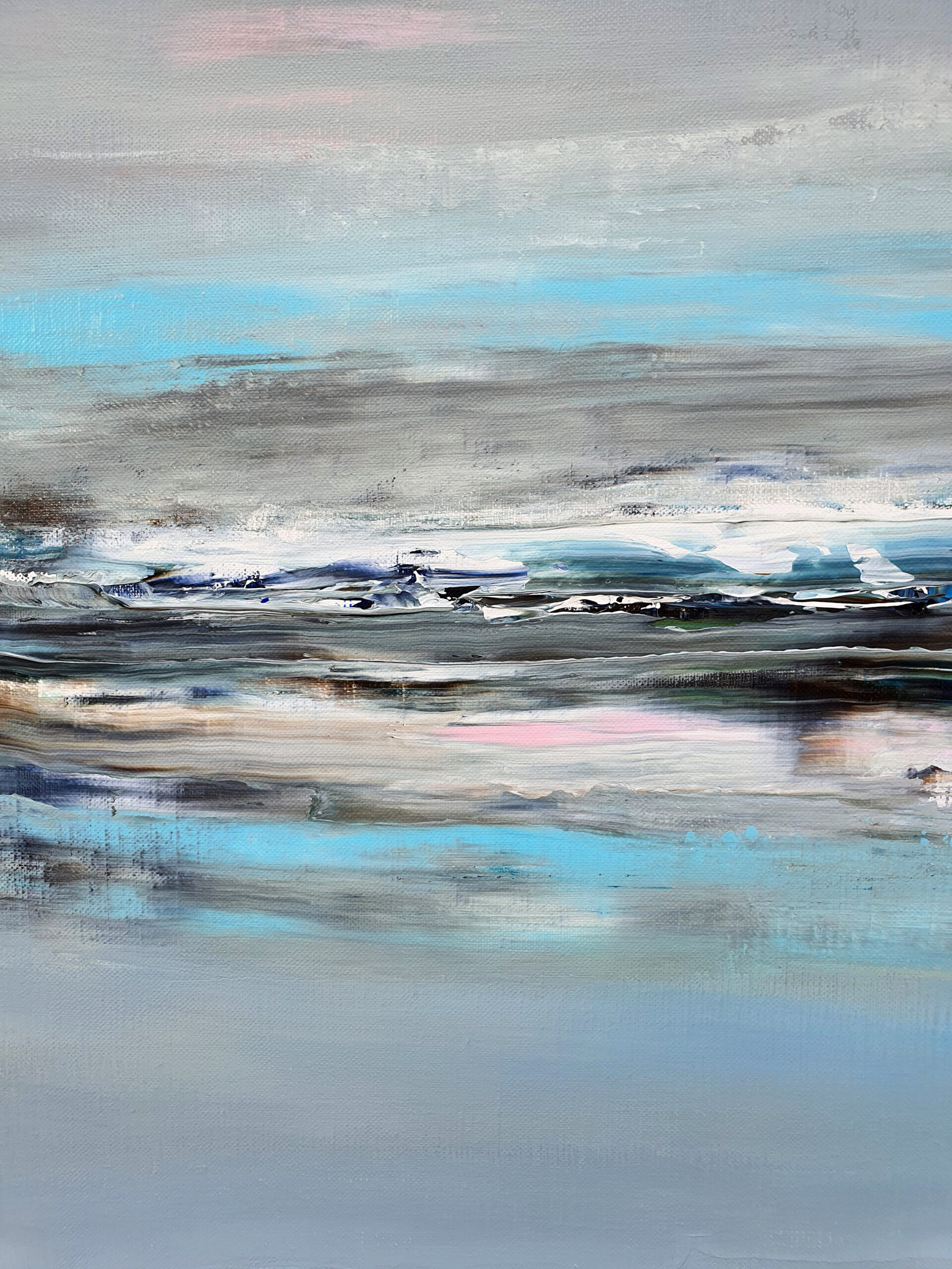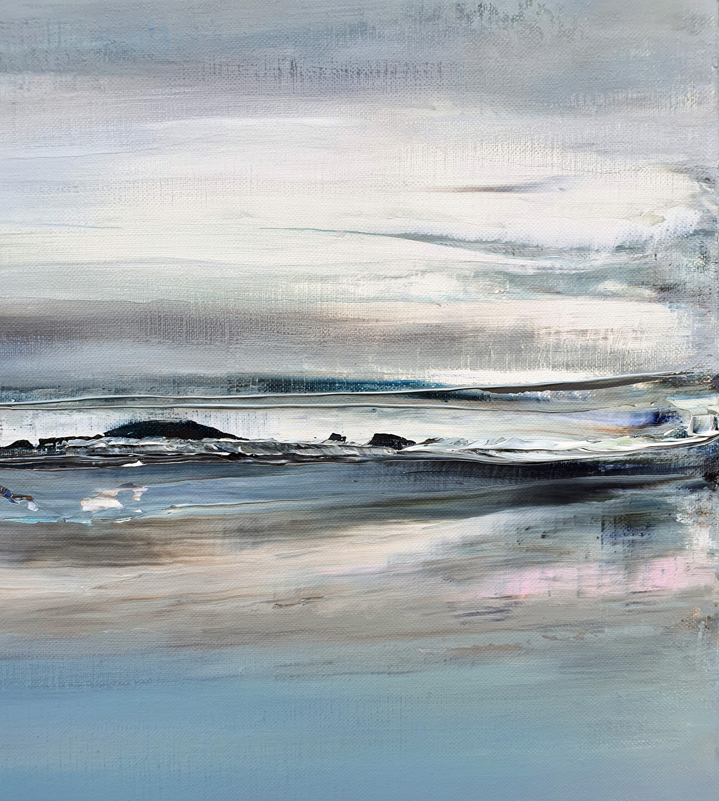 Dans ce paysage abstrait est évoqué un horizon marin où l’eau, le ciel et la terre s’unissent en dégradés poudrés, grisés et rosés. Cette atmosphère dense et diffuse est propre aux moments de transition. Ces heures bleues reflètent la fugacité de l’air et de l’eau : l’impermanence où le monde s’apaise.
