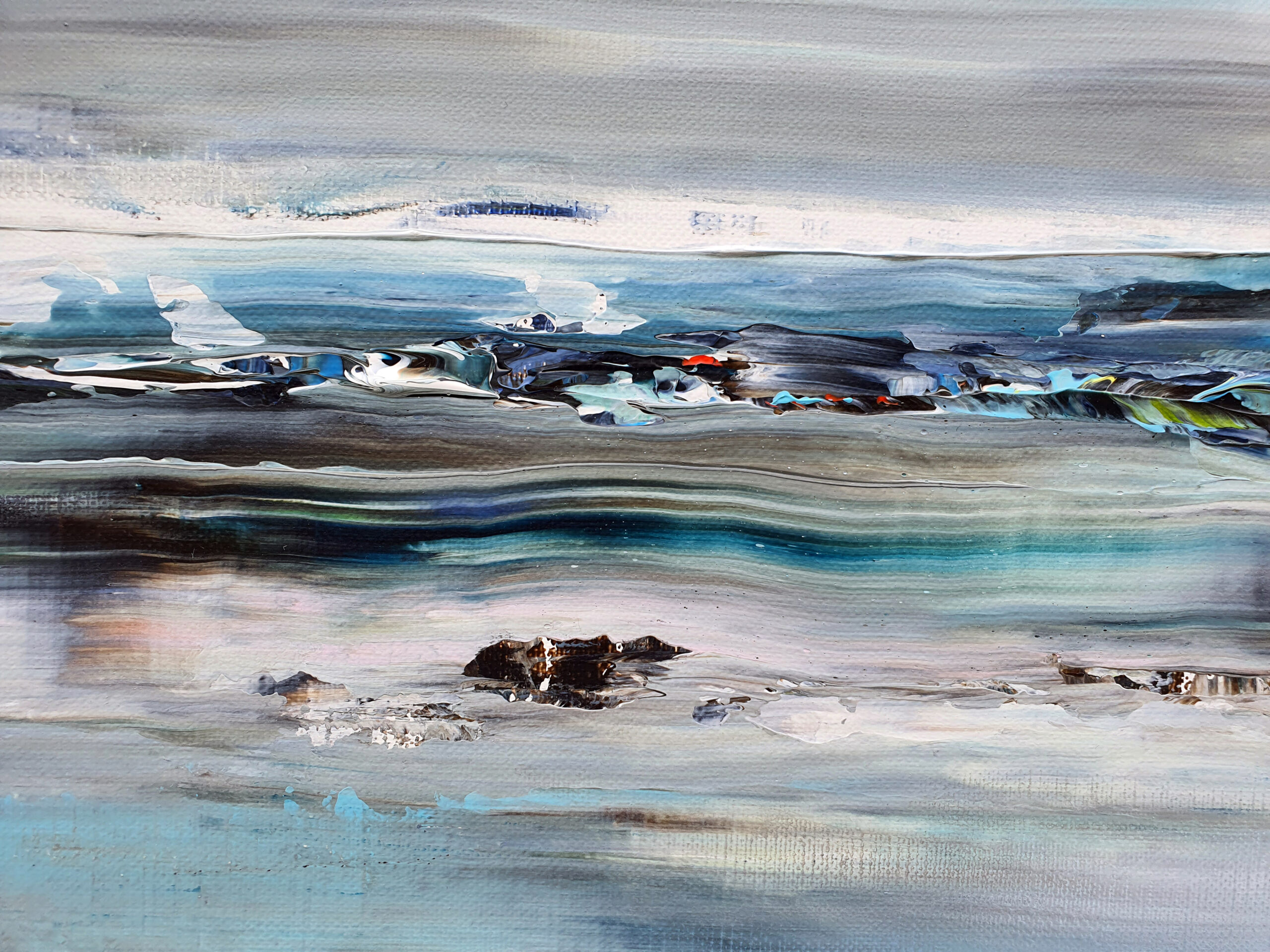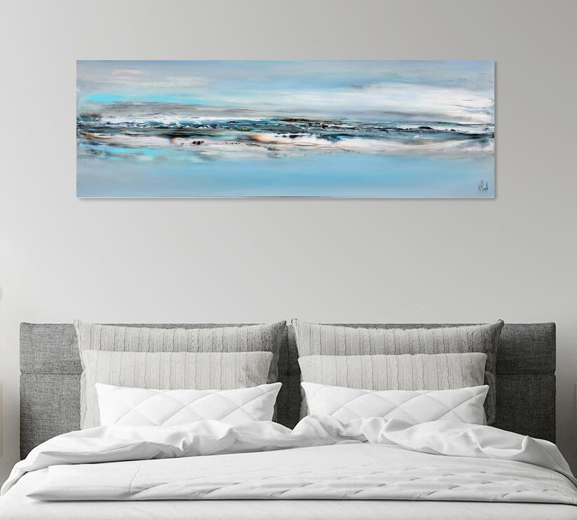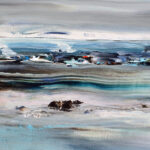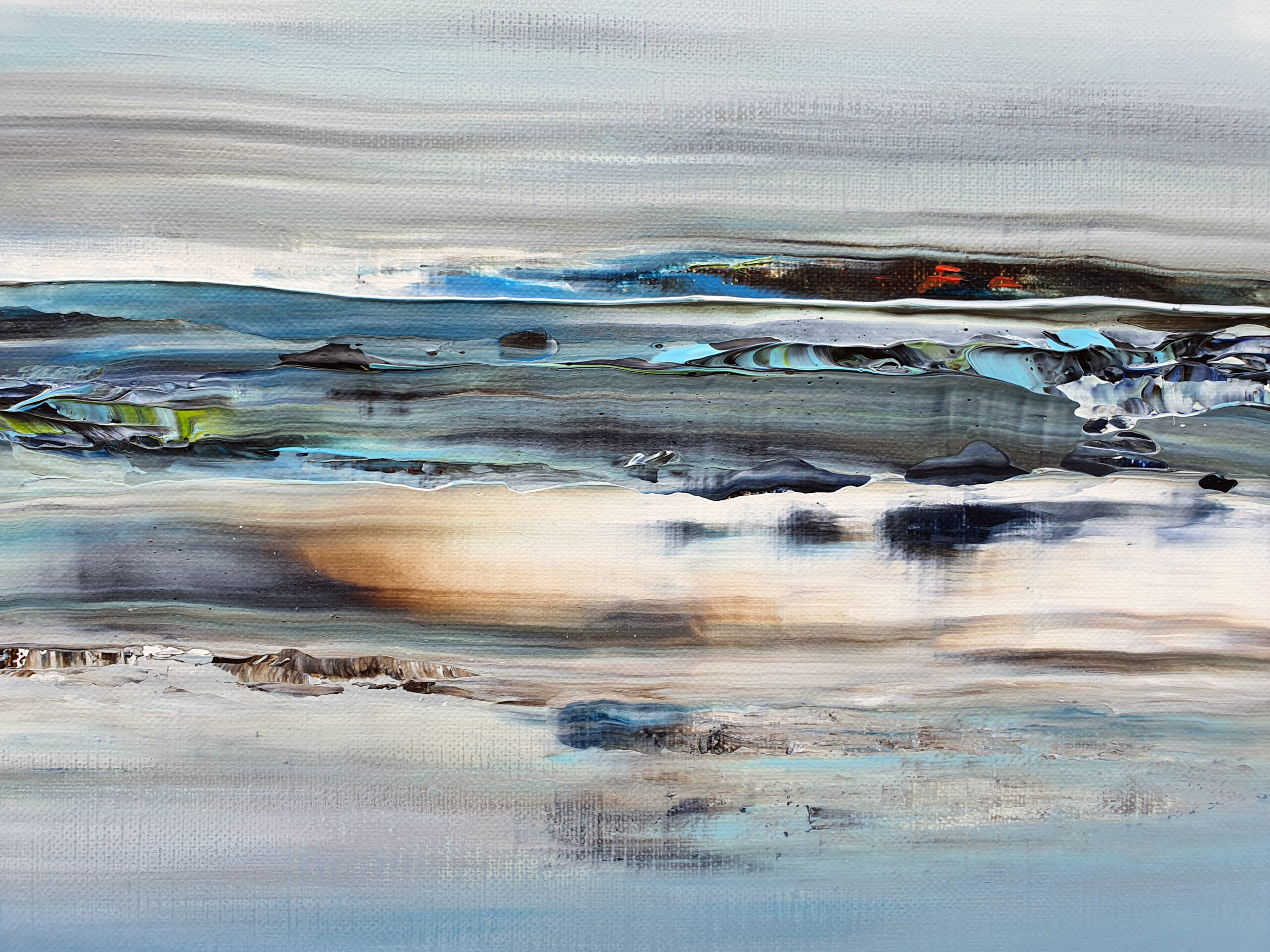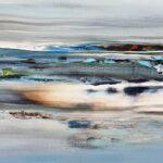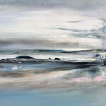 Dans ce paysage abstrait est évoqué un horizon marin où l’eau, le ciel et la terre s’unissent en dégradés poudrés, grisés et rosés. Cette atmosphère dense et diffuse est propre aux moments de transition. Ces heures bleues reflètent la fugacité de l’air et de l’eau : l’impermanence où le monde s’apaise.