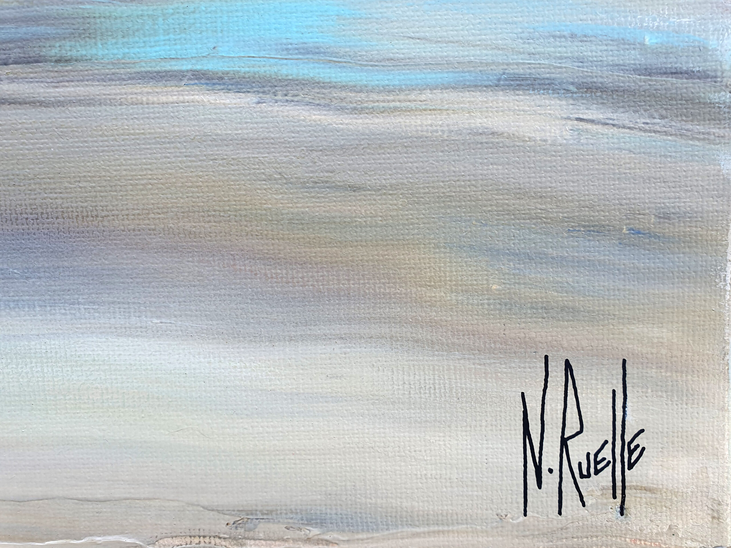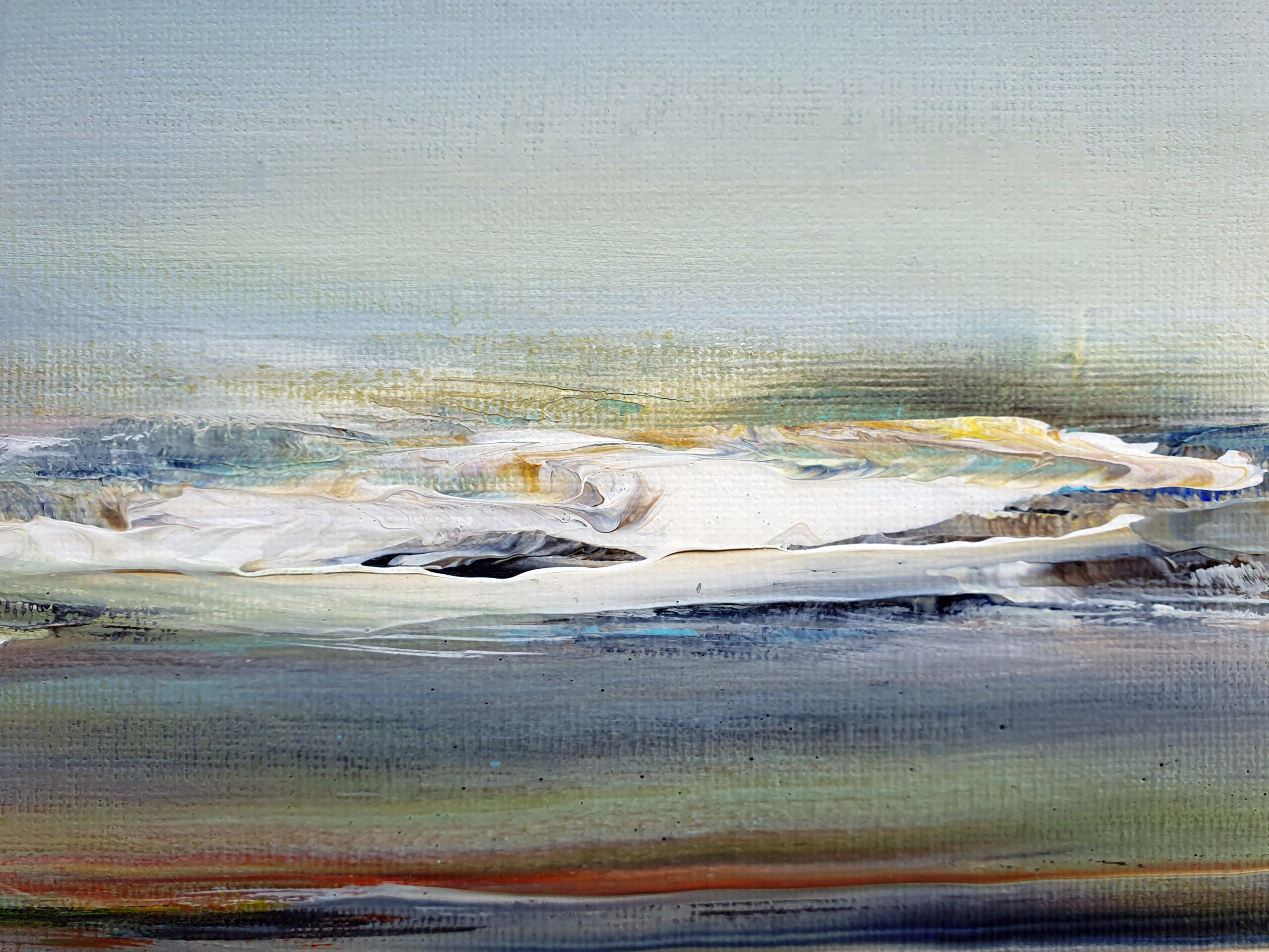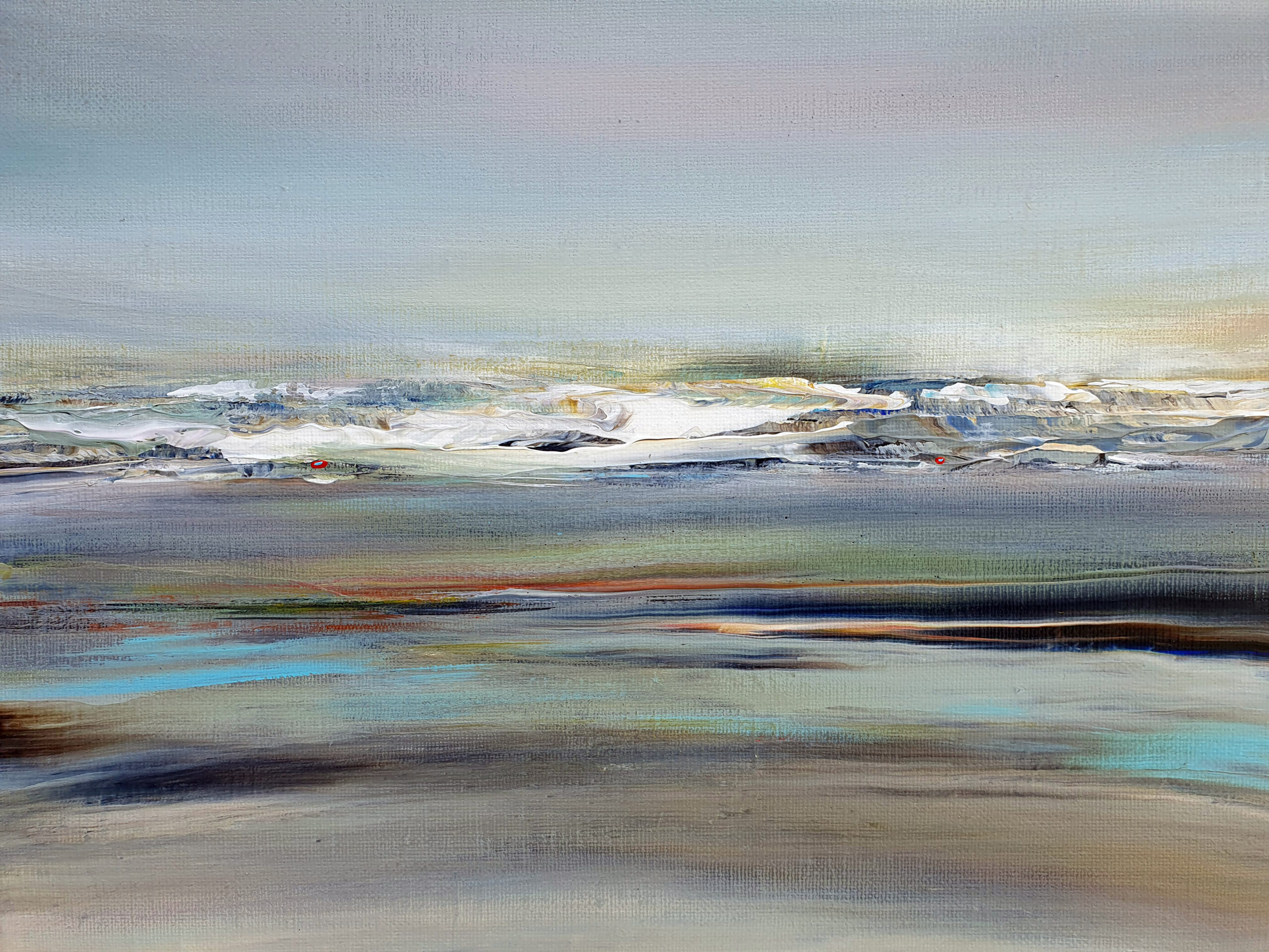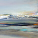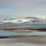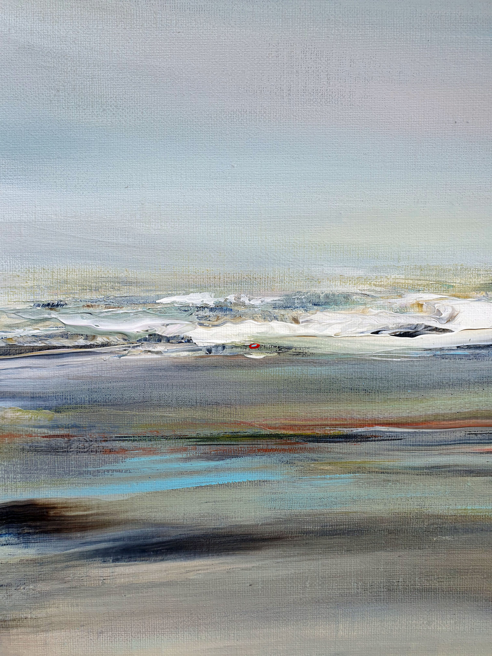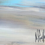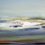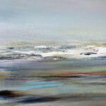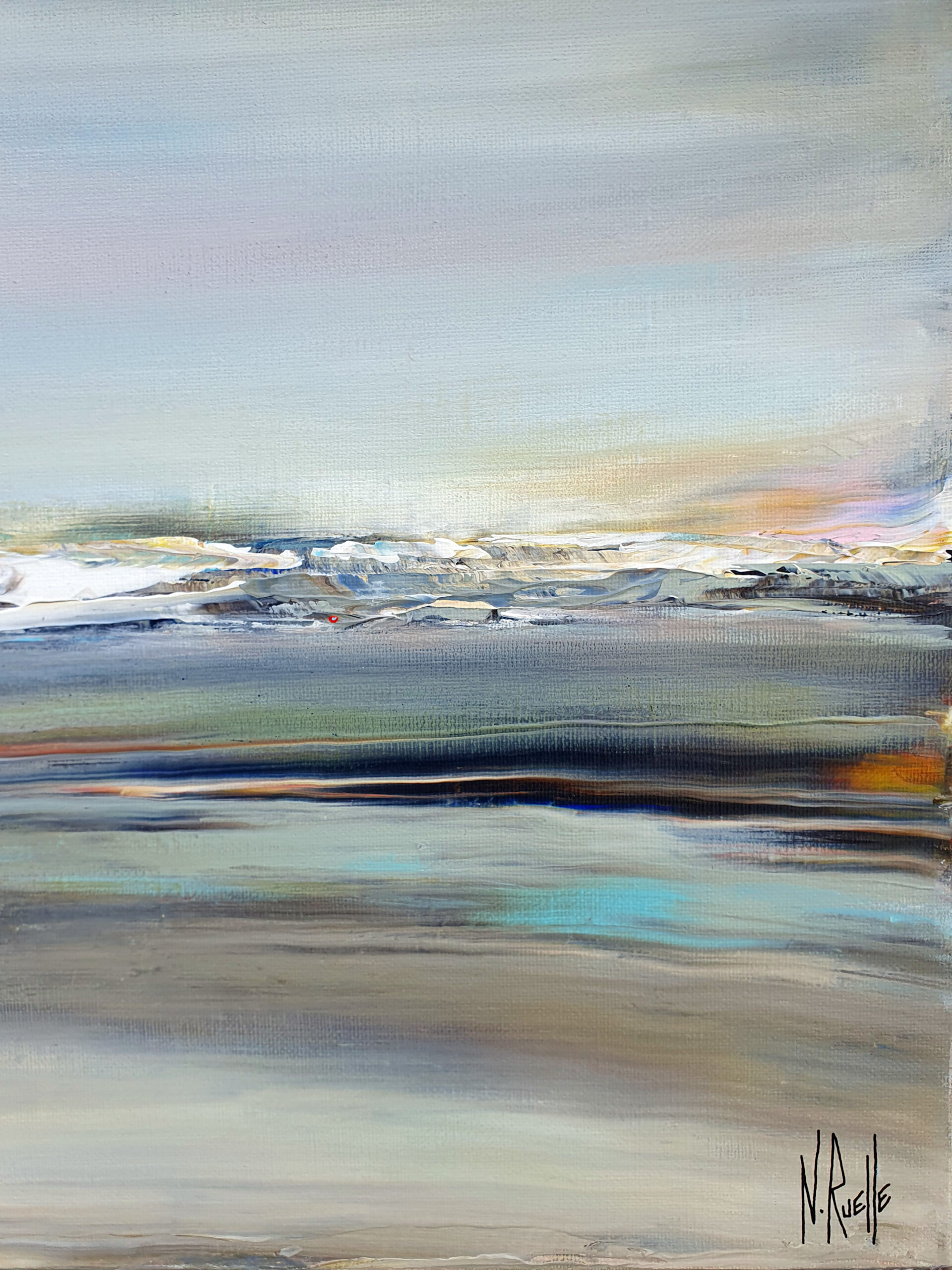 Oscillant entre figuration et abstraction, la peinture capture l’essence d’une aube silencieuse. Le regard est guidé vers la ligne d’horizon, là où la lumière commence à poindre. Les éléments se fondent dans une harmonie suspendue, déclinant une palette chromatique aliant gris perle, ocres sableux, bleus atmosphériques et reflets orangés. Ici le sujet est épuré, les formes simplifiées pour transformer le paysage en une expérience méditative. Avec « Matin calme », j’ai voulu créer un espace de respiration où le silence règne en maître.