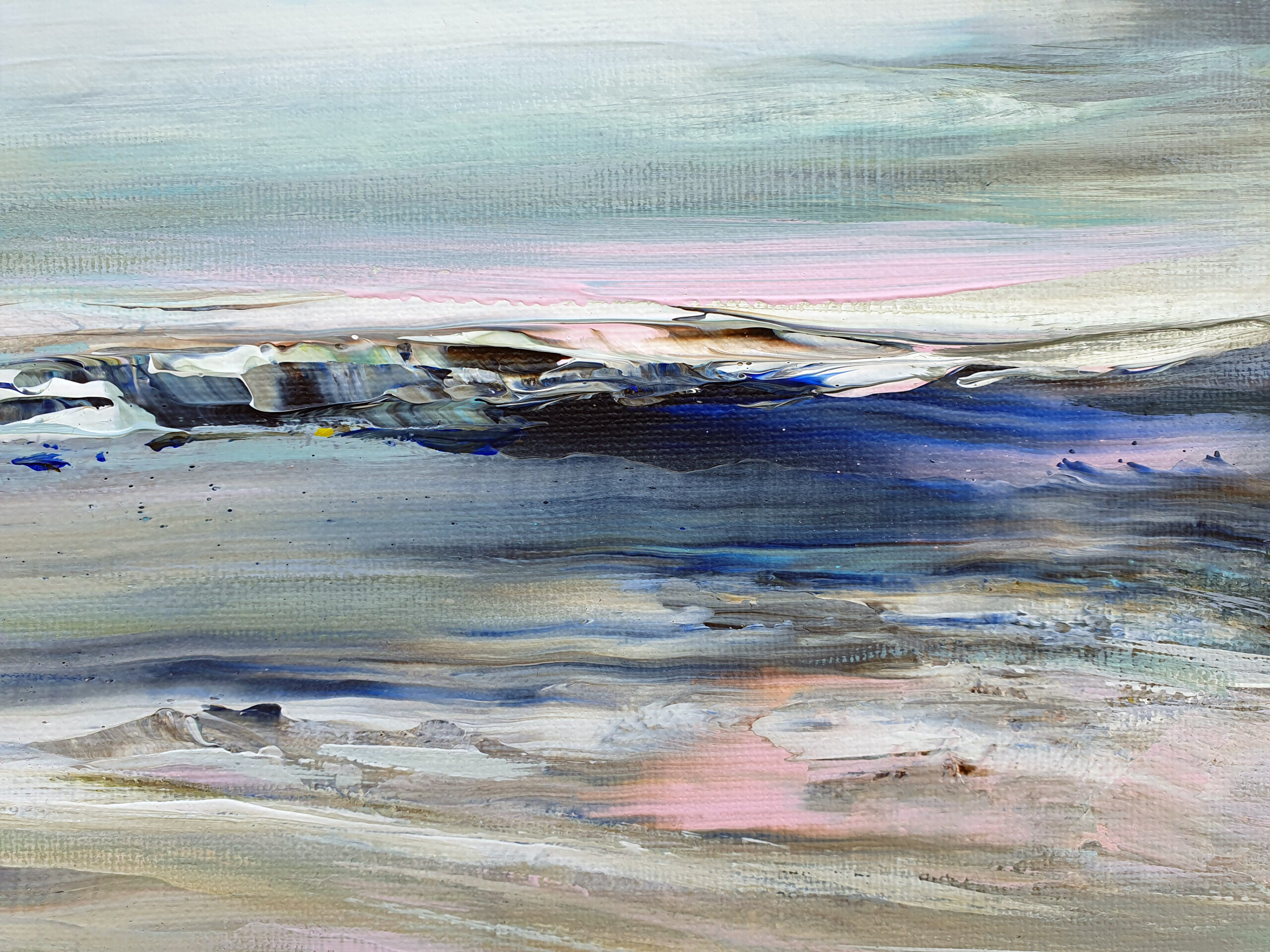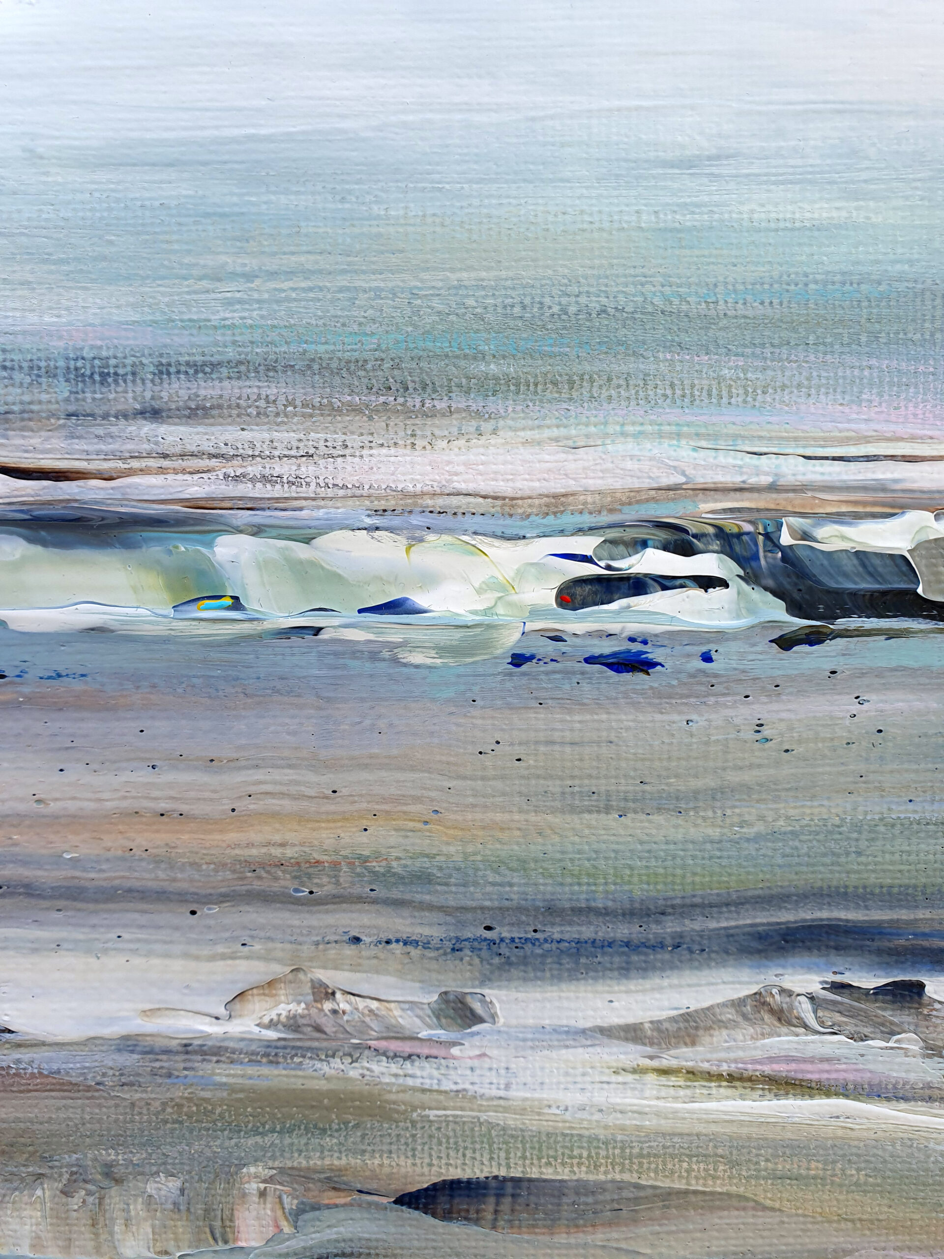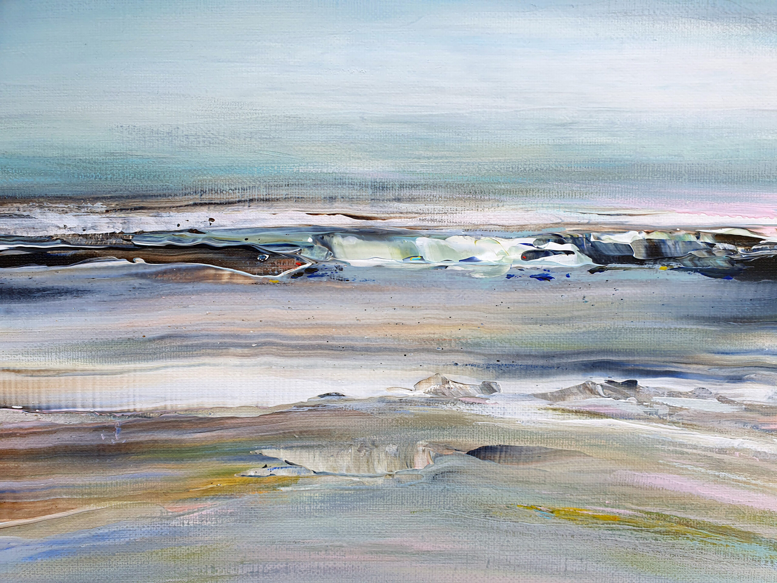 Cette toile saisit la sérénité fragile des premières lueurs du jour. Les bleus pâles et les gris doux du ciel et de l’eau se rencontrent dans une harmonie contemplative. La ligne d’horizon, plus sombre et texturée, est un point d’ancrage, un secret que le jour s’apprête à révéler. Des reflets délicats de rose pâle, de brun et de blanc s’animent et se fondent dans une danse. Ces touches lumineuses sont comme les promesses du jour. Avec « Premières lueurs », j’ai voulu que l’on ressente la quiétude et la beauté éphémère de ce moment suspendu.
