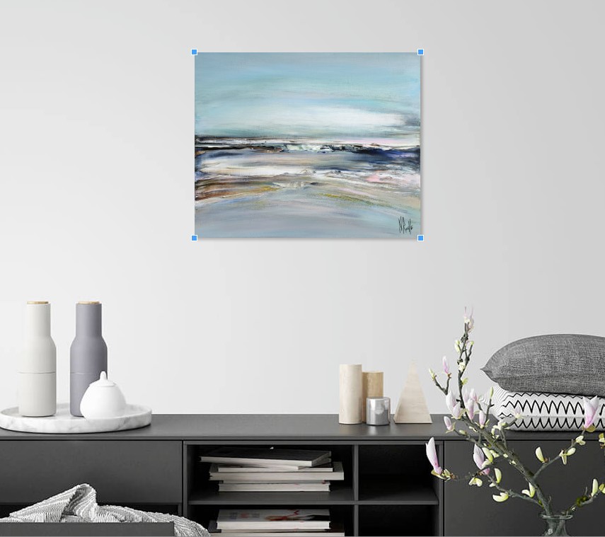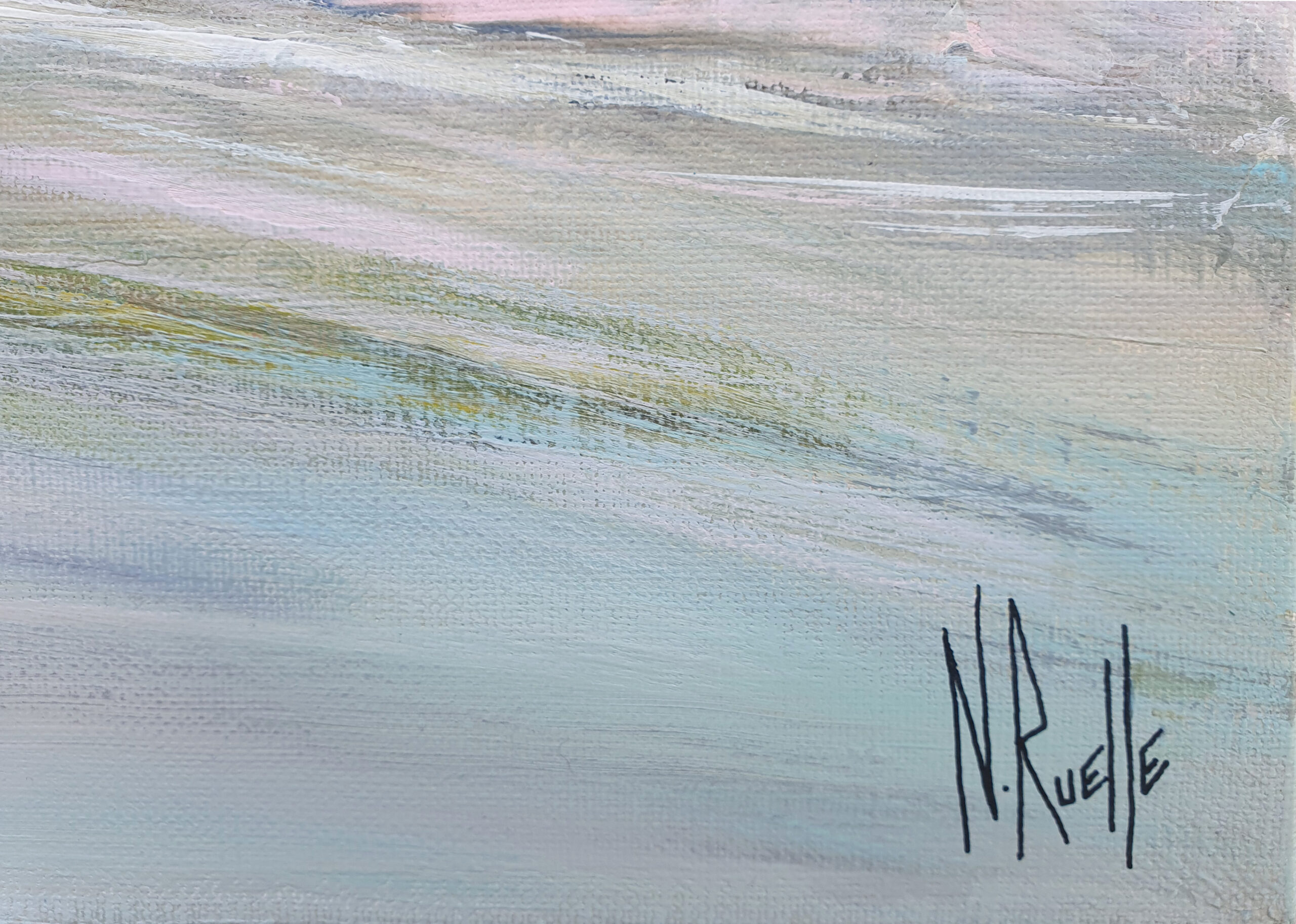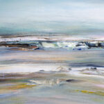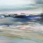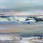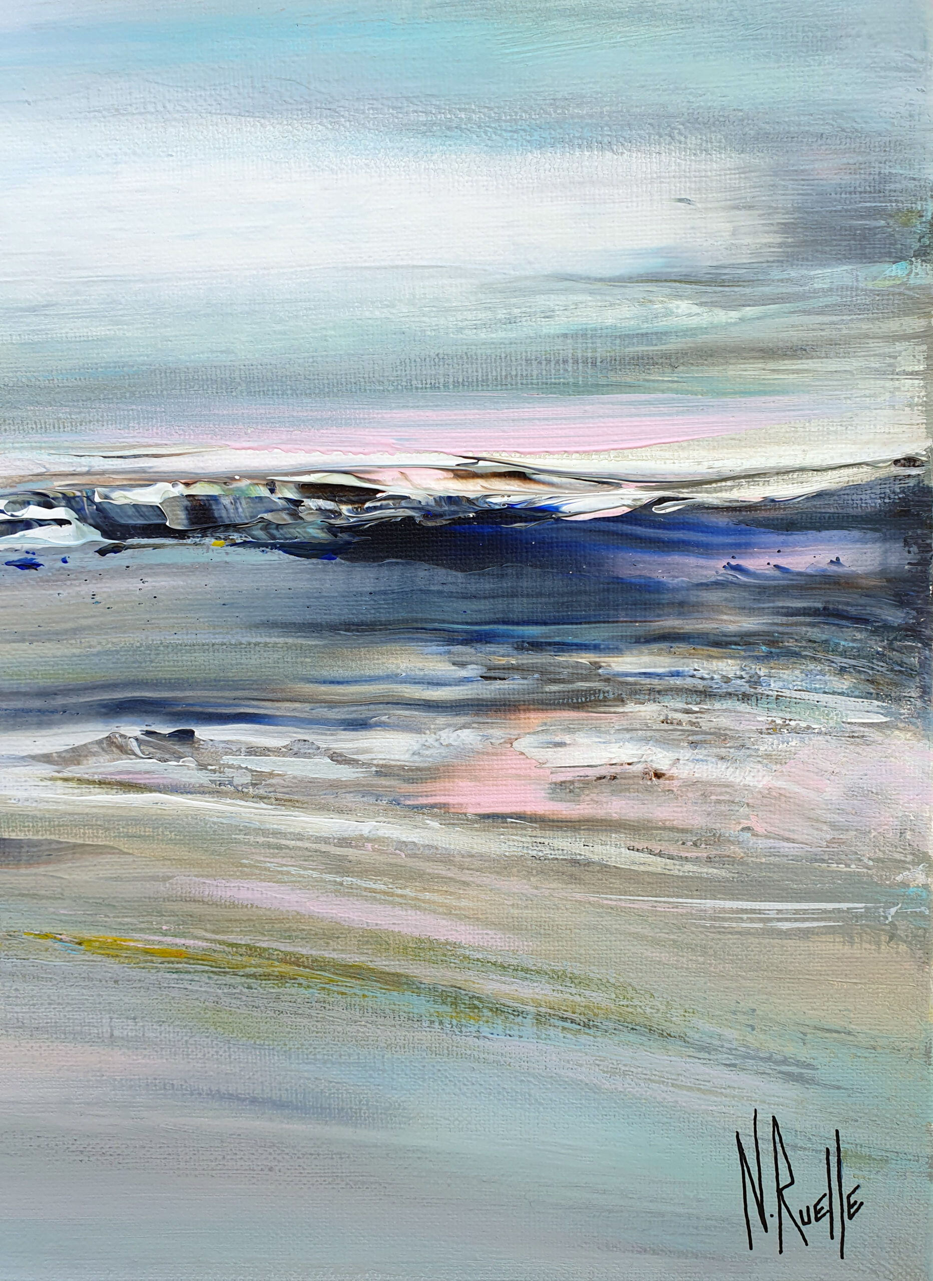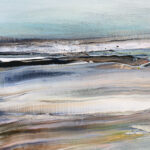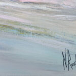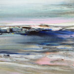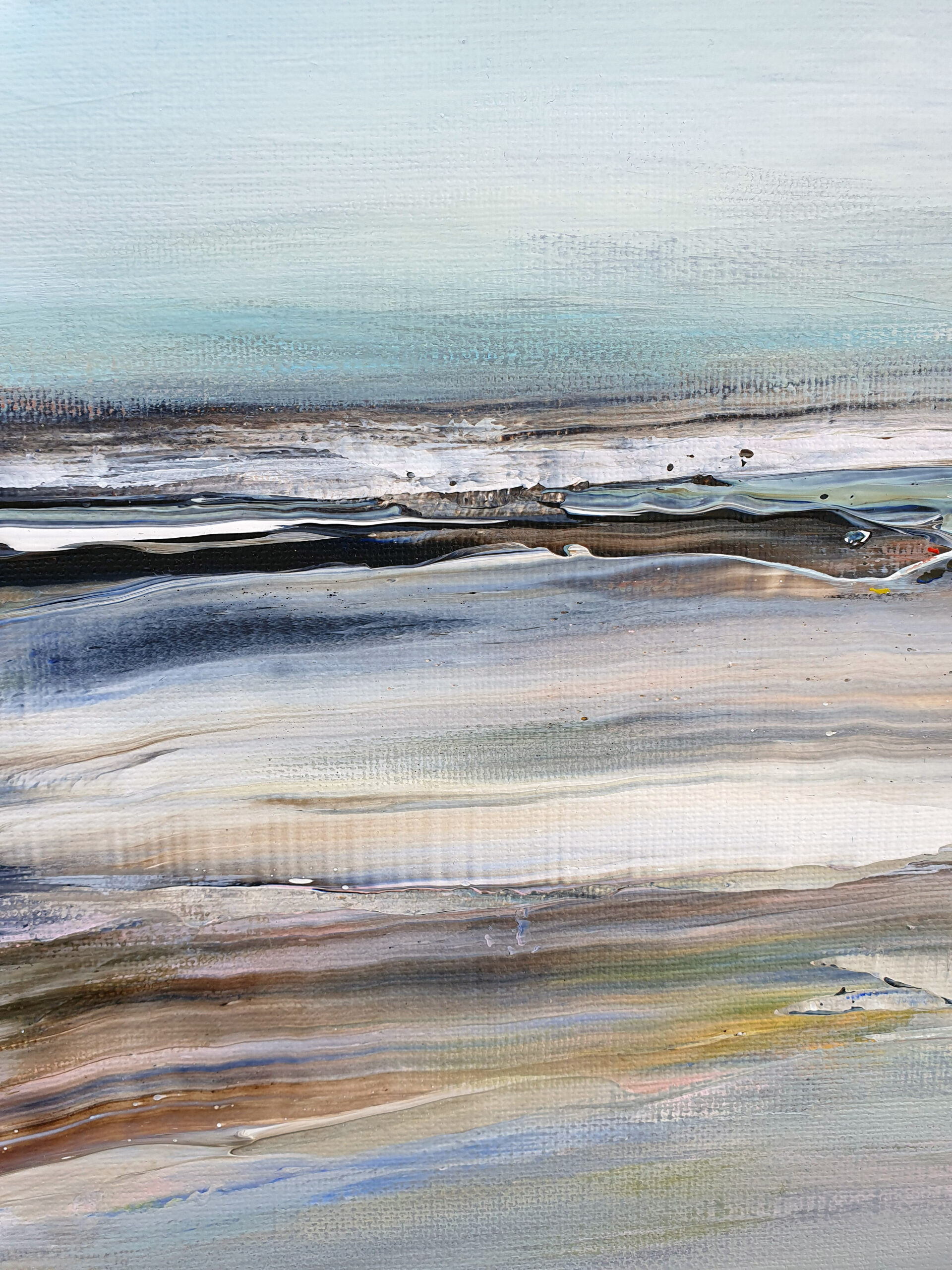 Cette toile saisit la sérénité fragile des premières lueurs du jour. Les bleus pâles et les gris doux du ciel et de l’eau se rencontrent dans une harmonie contemplative. La ligne d’horizon, plus sombre et texturée, est un point d’ancrage, un secret que le jour s’apprête à révéler. Des reflets délicats de rose pâle, de brun et de blanc s’animent et se fondent dans une danse. Ces touches lumineuses sont comme les promesses du jour. Avec « Premières lueurs », j’ai voulu que l’on ressente la quiétude et la beauté éphémère de ce moment suspendu.