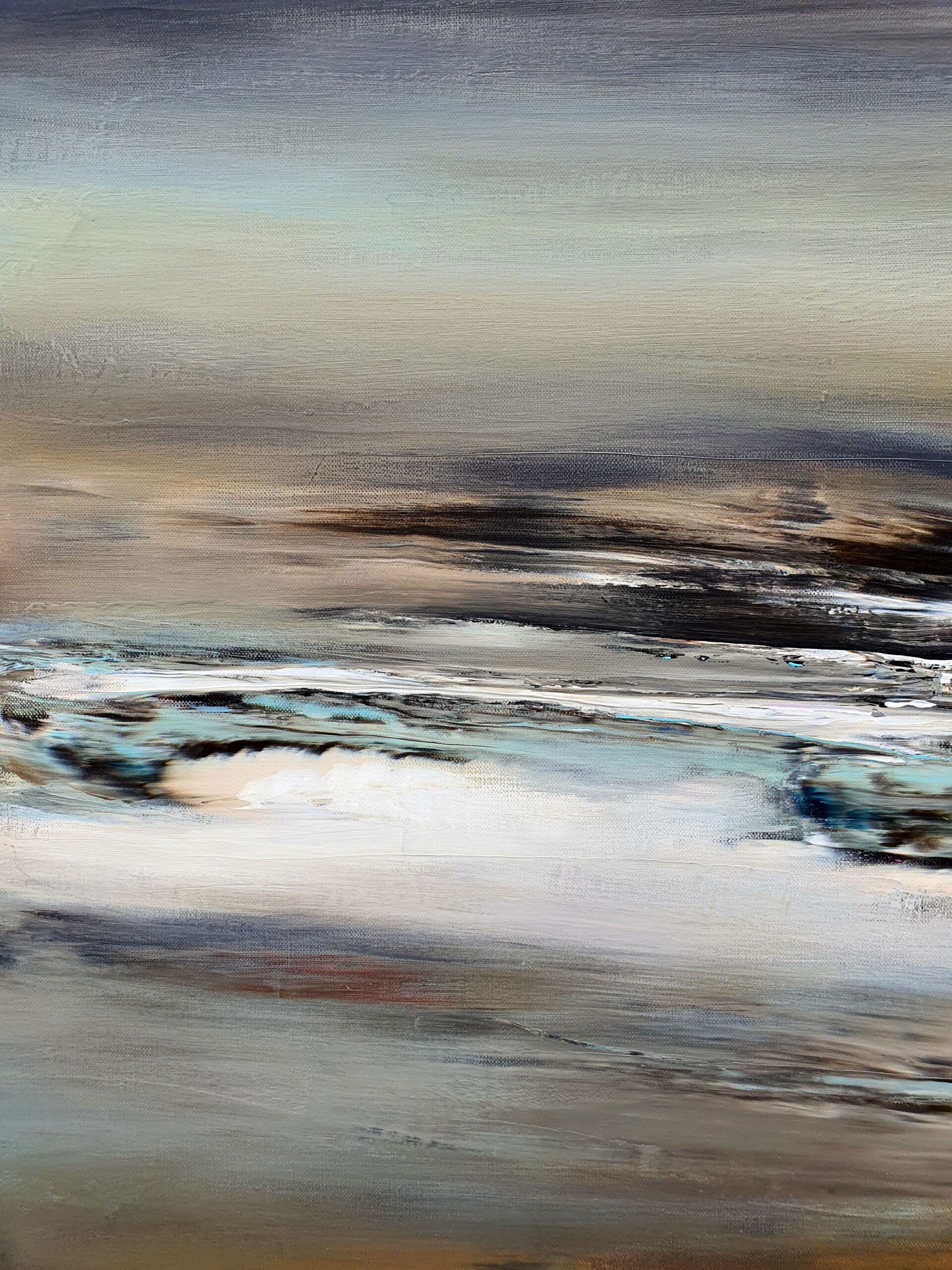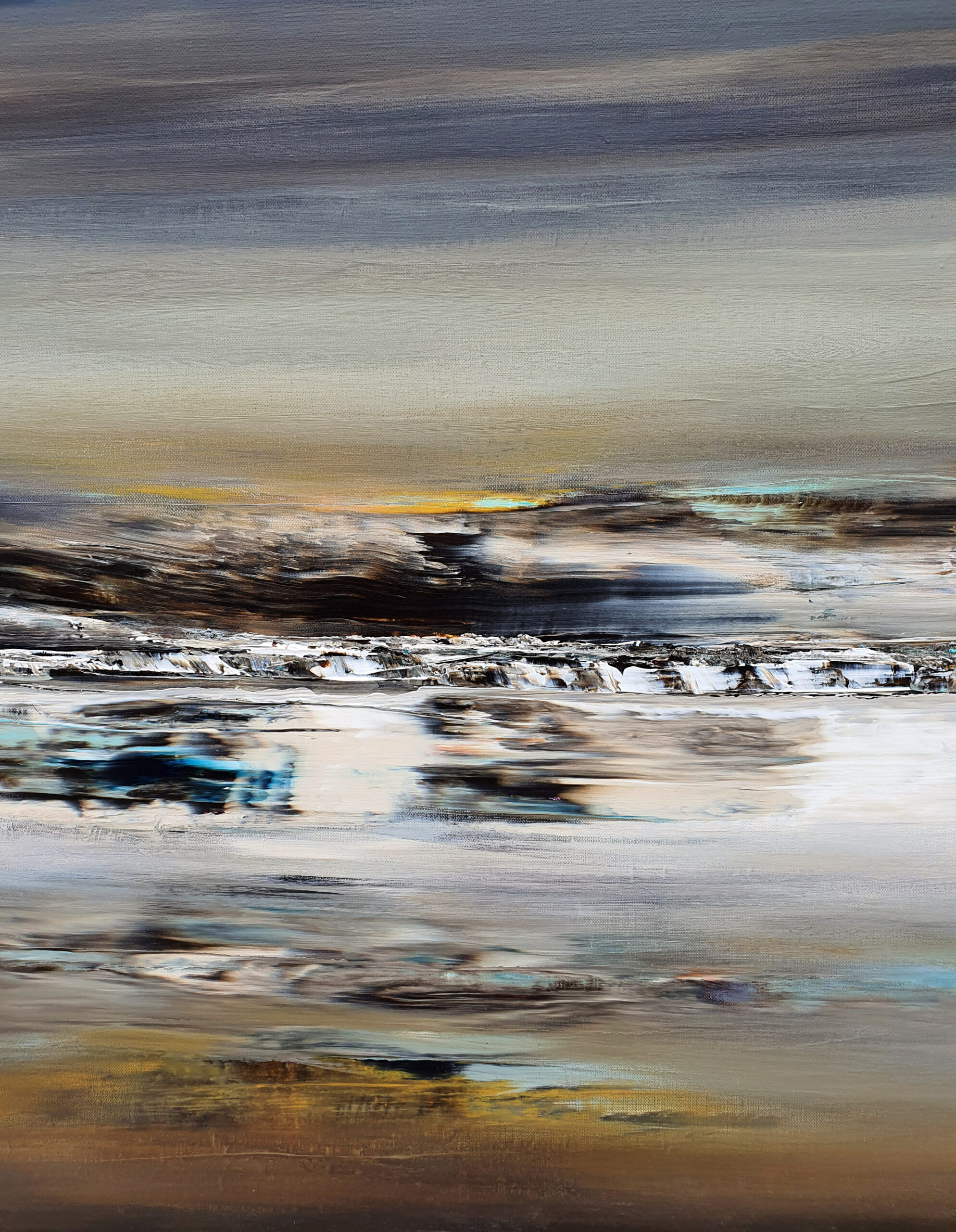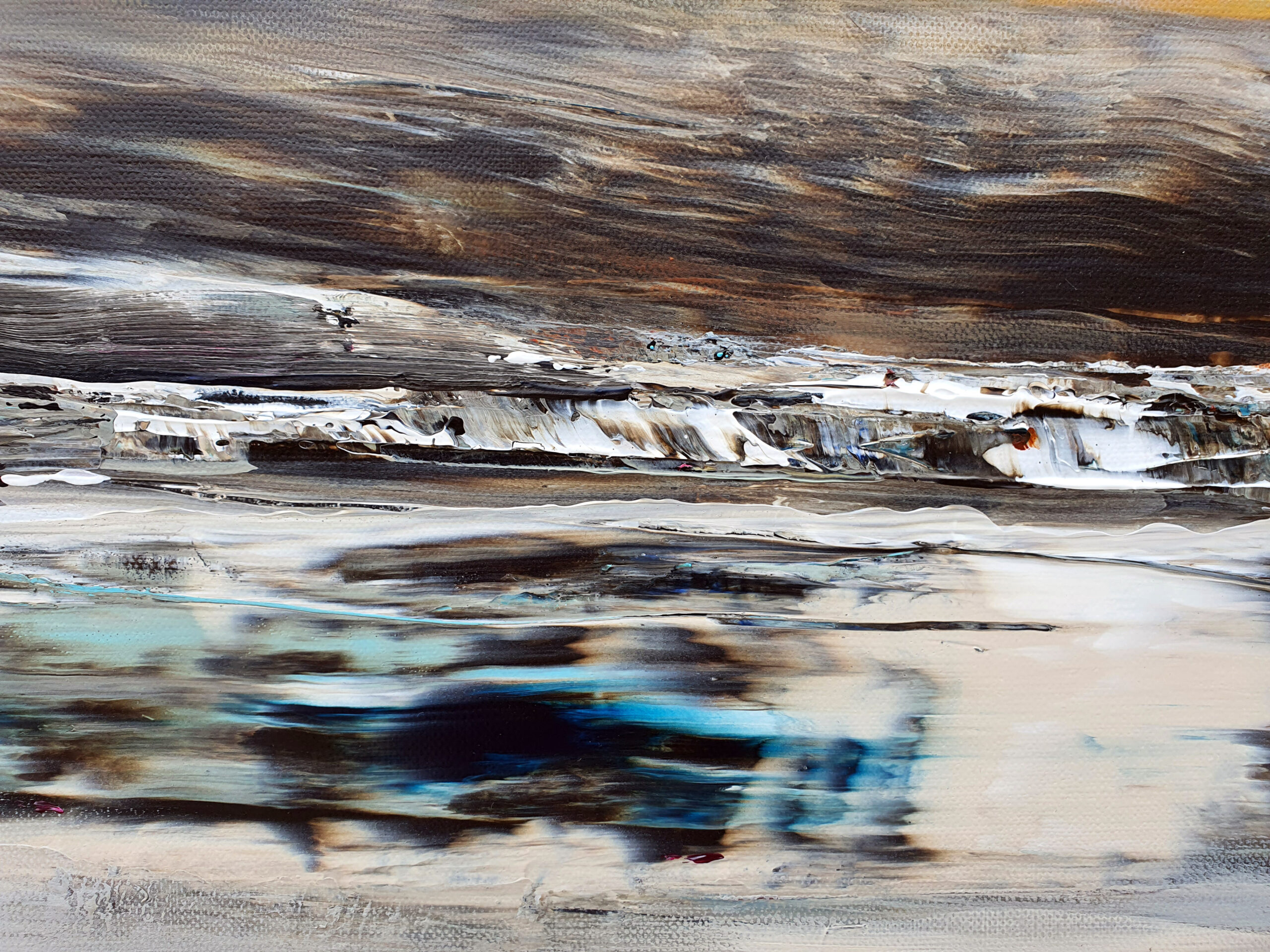 « Rémanence » capture ce qui subsiste quand l’instant s’est enfui. La toile évoque cette trace persistante, ce souvenir visuel qui continue de vibrer : l’écho d’un mouvement. Il y a la notion de passage et d’empreinte du temps. Pour traduire cette sensation, j’ai travaillé sur la profondeur des contrastes. Les bruns profonds jouent avec des ocres terreux tandis que le cœur de la toile est traversé par un jaillissement de lumière, déchirure de blanc et de turquoise. Avec le geste et la matière, j’ai voulu qu’on ressente une puissante énergie : un souffle chargé d’électricité.