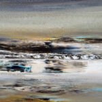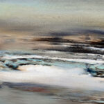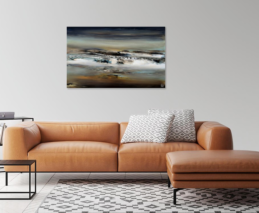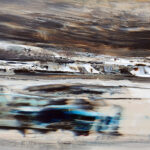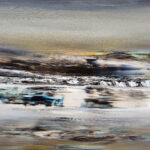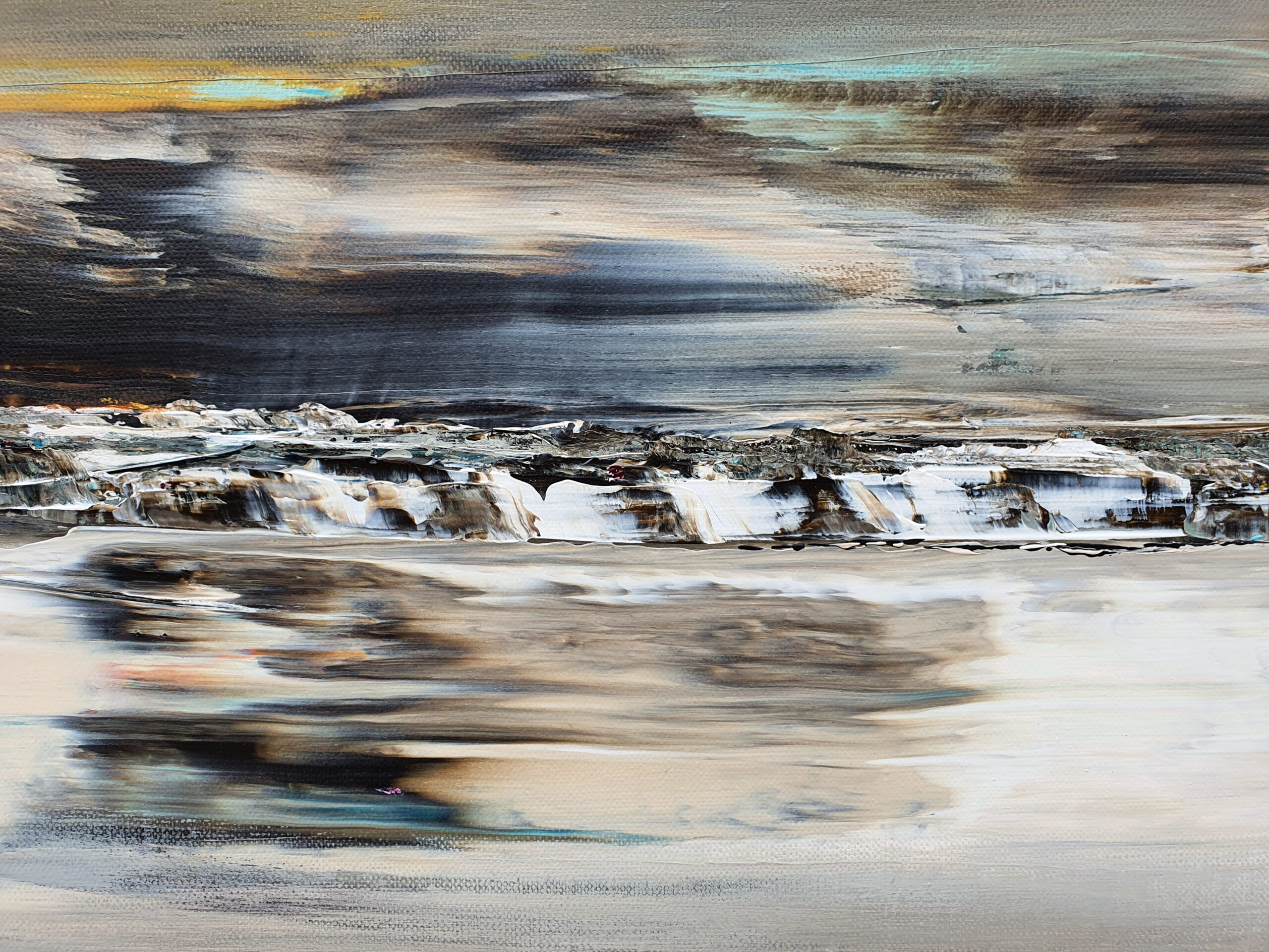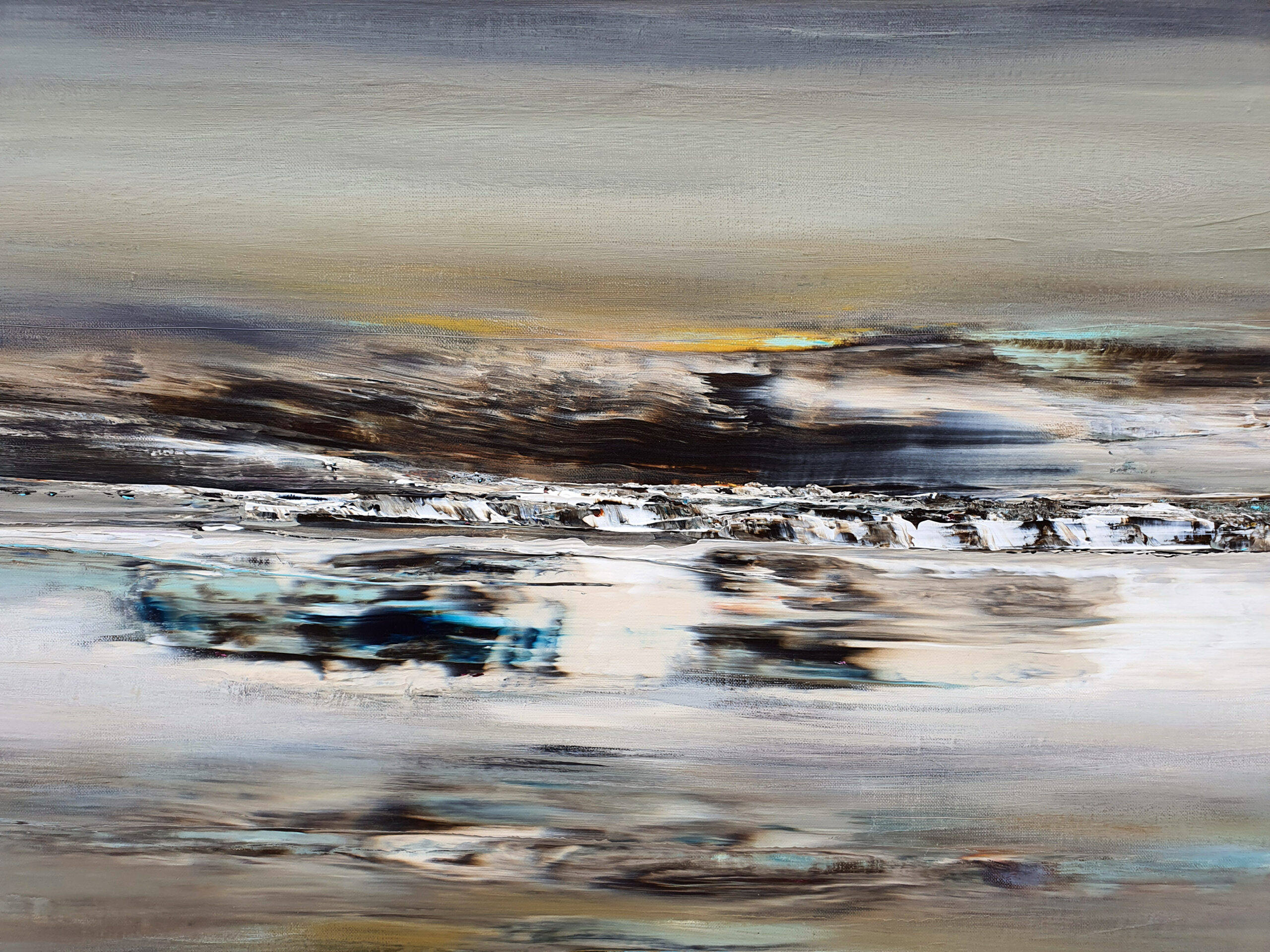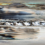 « Rémanence » capture ce qui subsiste quand l’instant s’est enfui. La toile évoque cette trace persistante, ce souvenir visuel qui continue de vibrer : l’écho d’un mouvement. Il y a la notion de passage et d’empreinte du temps. Pour traduire cette sensation, j’ai travaillé sur la profondeur des contrastes. Les bruns profonds jouent avec des ocres terreux tandis que le cœur de la toile est traversé par un jaillissement de lumière, déchirure de blanc et de turquoise. Avec le geste et la matière, j’ai voulu qu’on ressente une puissante énergie : un souffle chargé d’électricité.