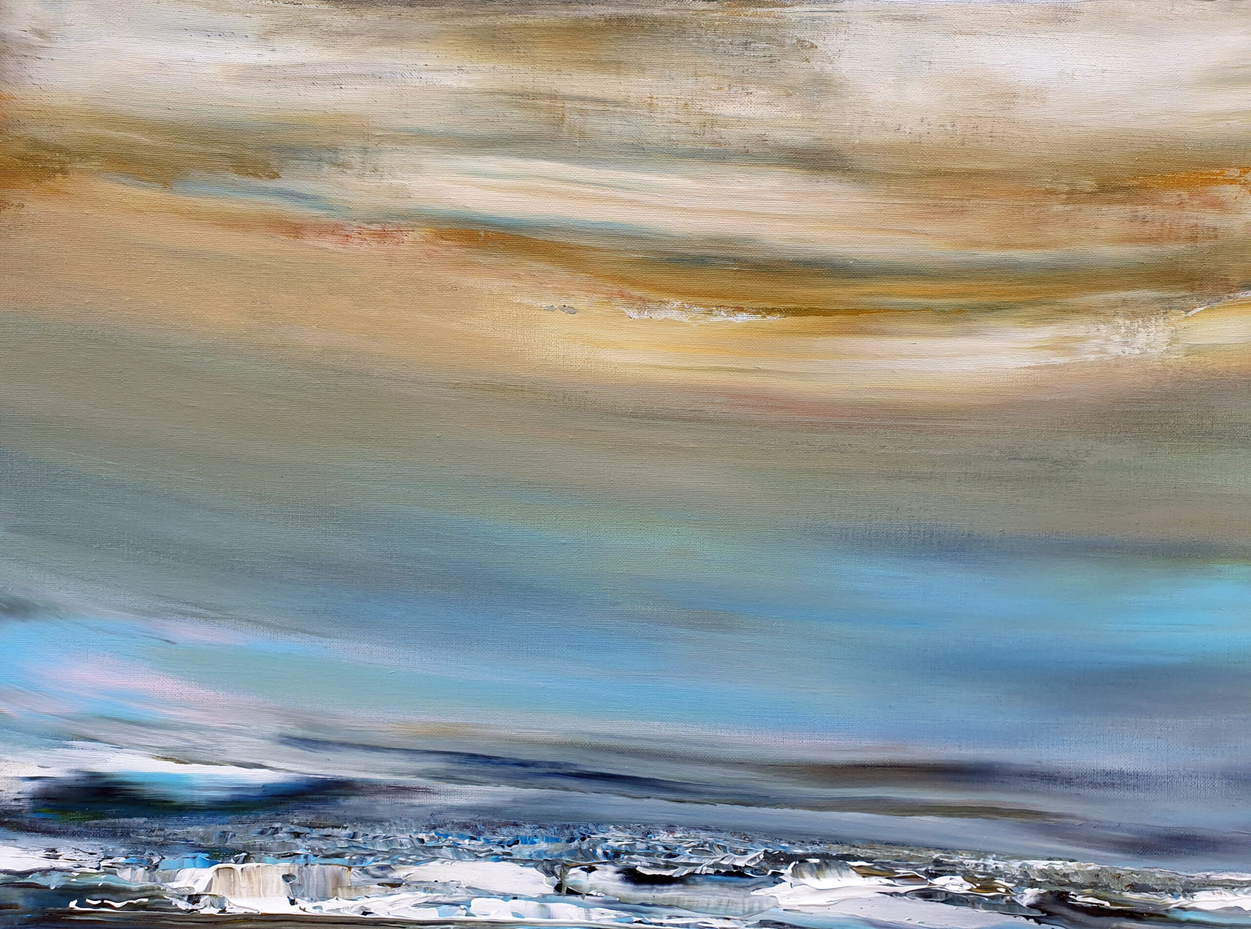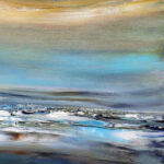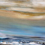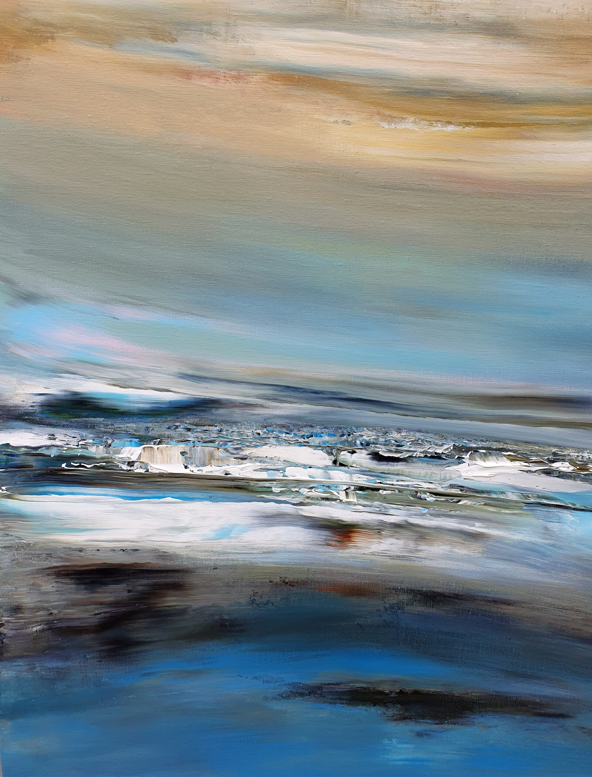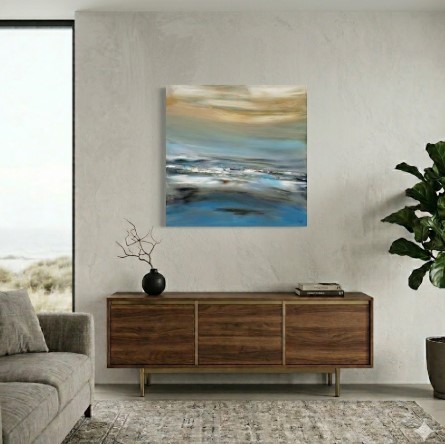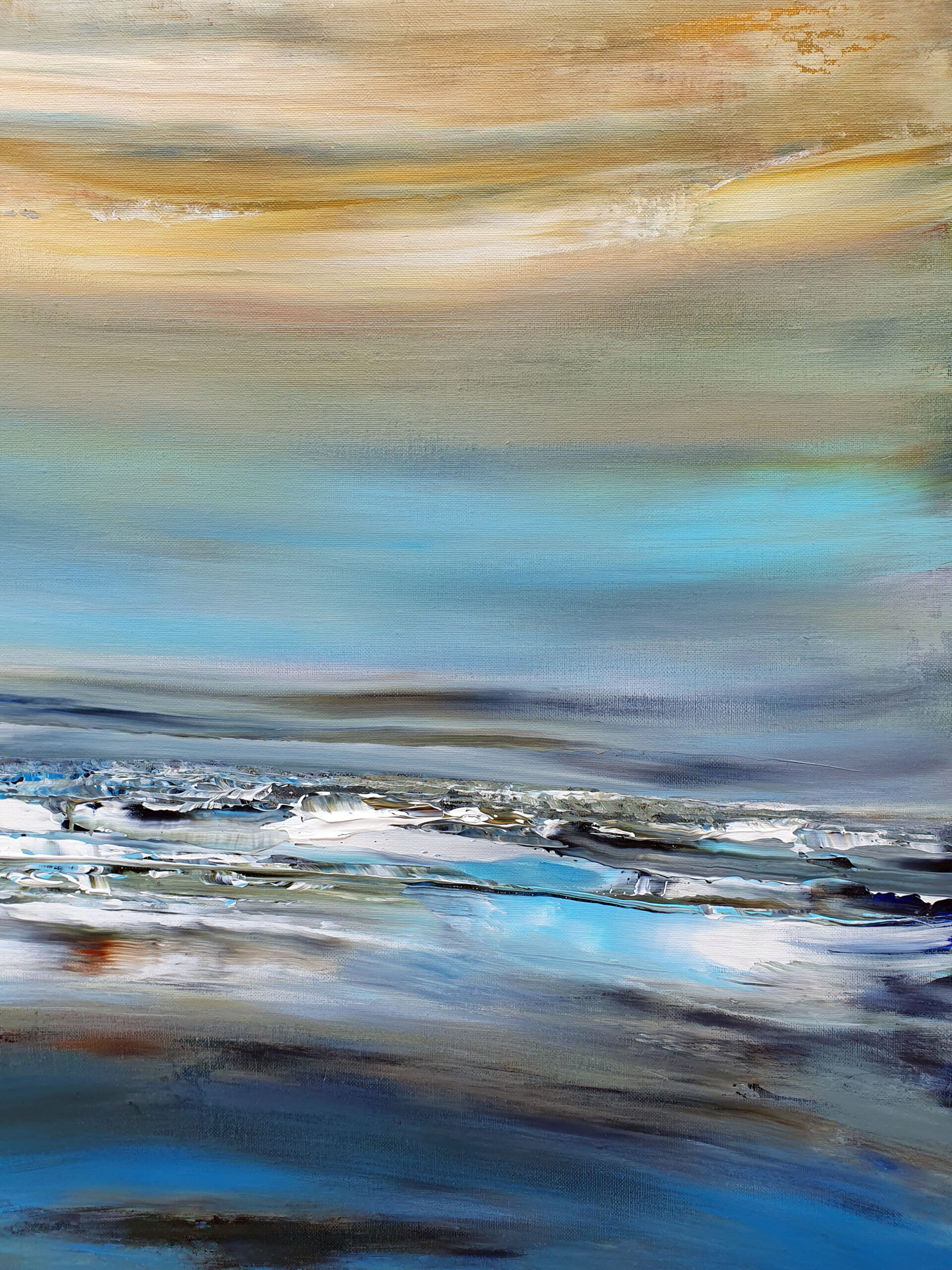 Dans « Résonance », la frontière entre le ciel, la terre et l’eau s’efface au profit d’une immersion dans l’abstraction lyrique. Avec une gestualité fluide, j’ai voulu évoquer l’immensité d’un paysage côtier en jouant sur la chaleur des ocres et la profondeur des bleus. Pour donner du rythme au coeur de la toile et capturer des effets de lumière et de jaillissement, j’ai également travaillé en empâtements dynamiques. Au-delà de représenter la nature, mon intention était de créer une profondeur atmosphérique pour aspirer le regard, entre puissance et apaisement.