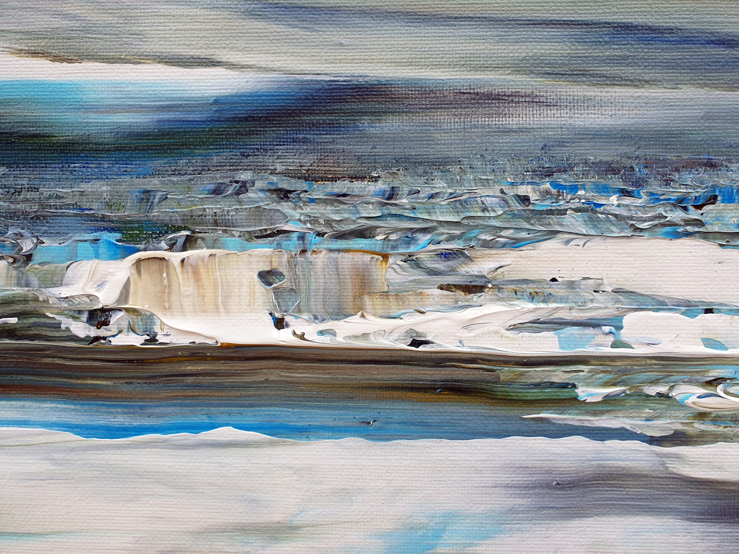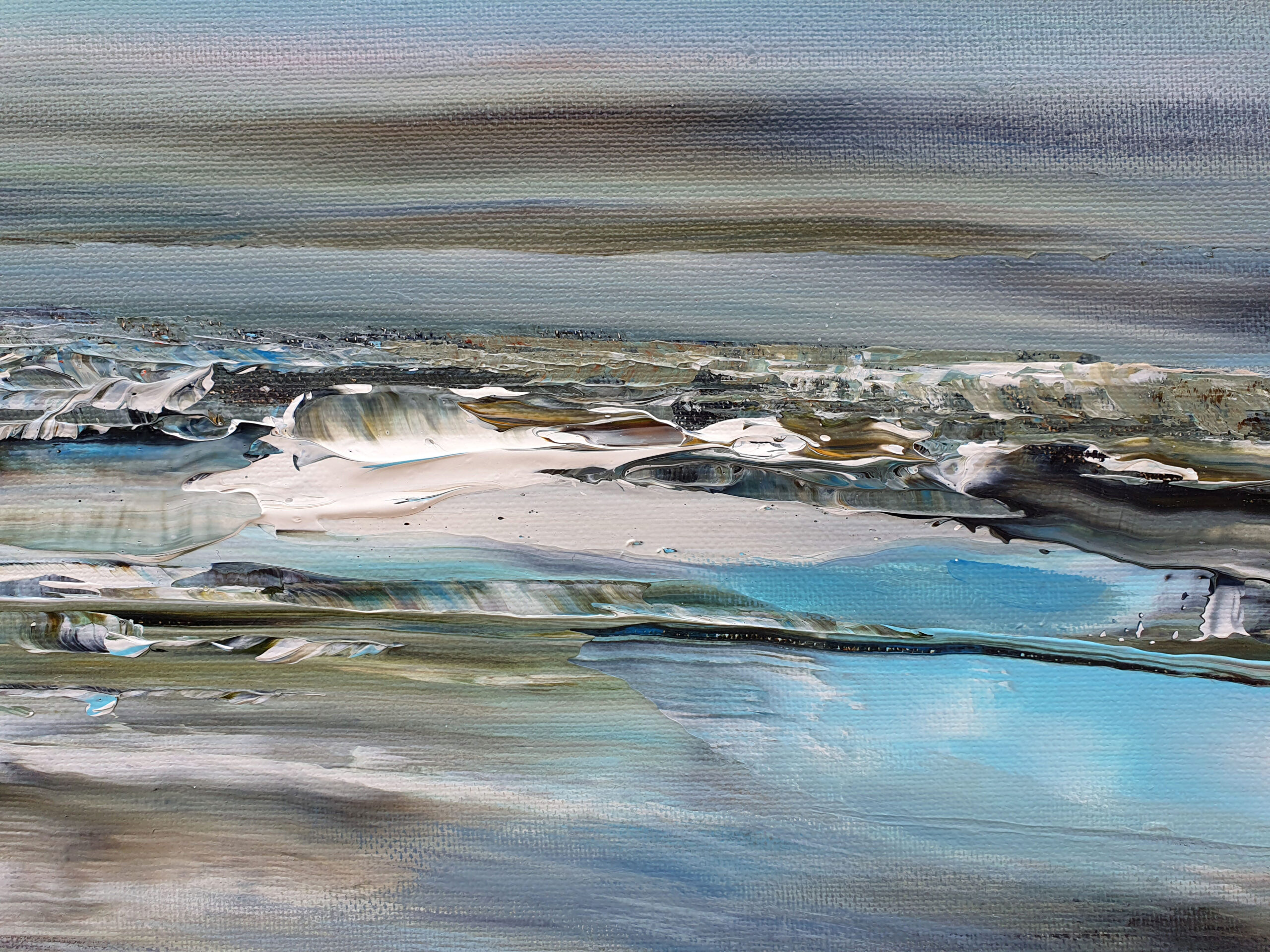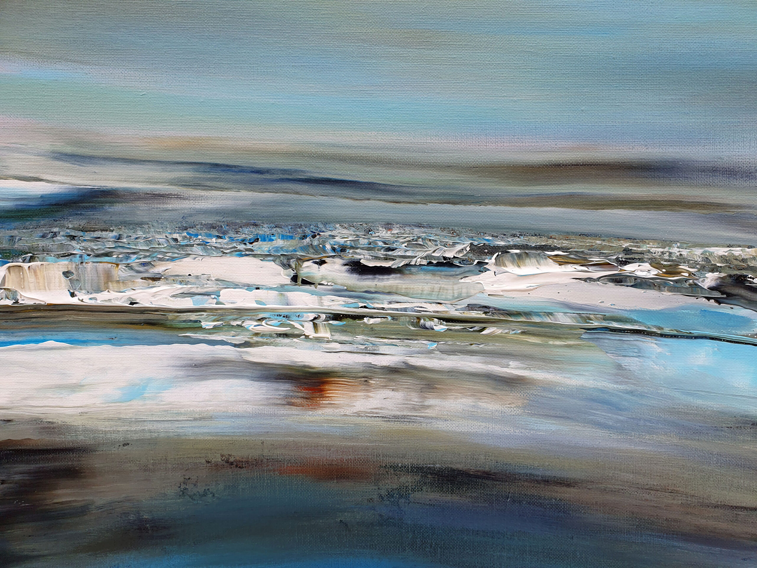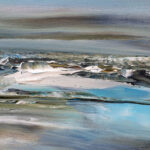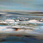 Dans « Résonance », la frontière entre le ciel, la terre et l’eau s’efface au profit d’une immersion dans l’abstraction lyrique. Avec une gestualité fluide, j’ai voulu évoquer l’immensité d’un paysage côtier en jouant sur la chaleur des ocres et la profondeur des bleus. Pour donner du rythme au coeur de la toile et capturer des effets de lumière et de jaillissement, j’ai également travaillé en empâtements dynamiques. Au-delà de représenter la nature, mon intention était de créer une profondeur atmosphérique pour aspirer le regard, entre puissance et apaisement.