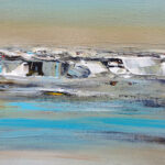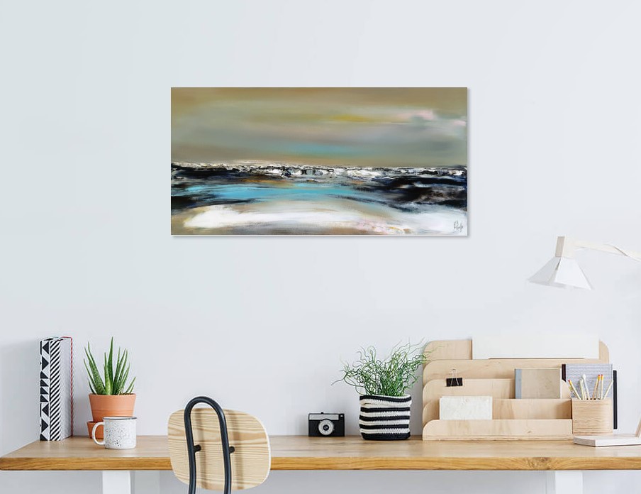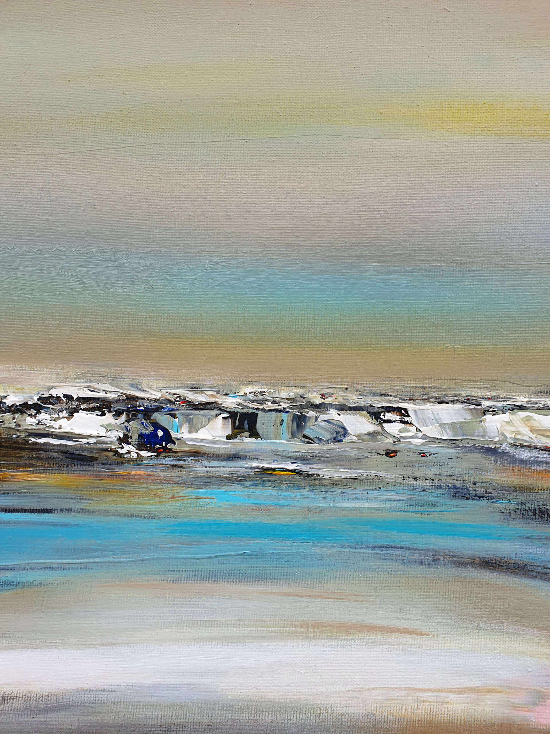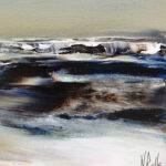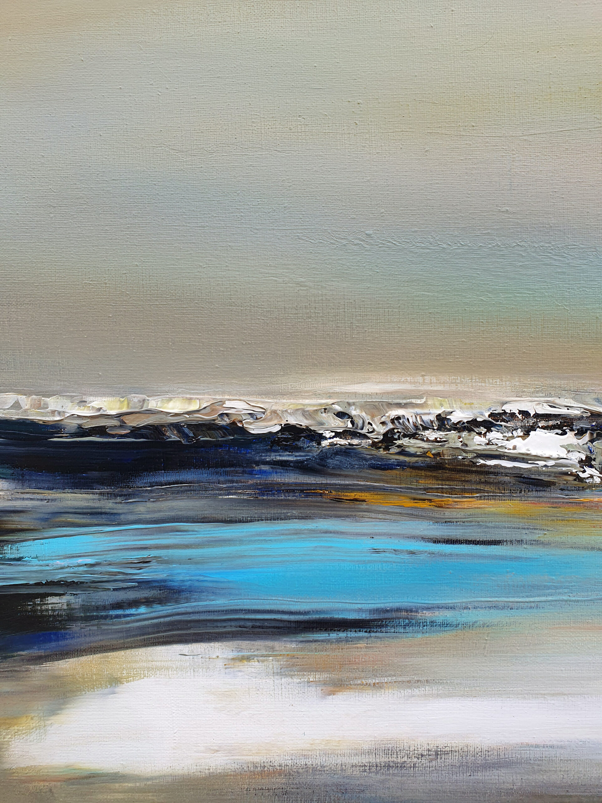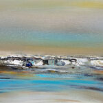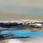 J’ai voulu saisir avec « Solstice » un moment de bascule, un passage temporel. Le ciel atmosphérique est irradié par une lumière dorée. Une bande de bleu turquoise électrique vient fendre la composition, apportant une clarté presque surnaturelle. Etymologiquement, le solstice représente le « soleil qui s’arrête ». La toile capture cet instant juste avant que le cycle ne reparte.