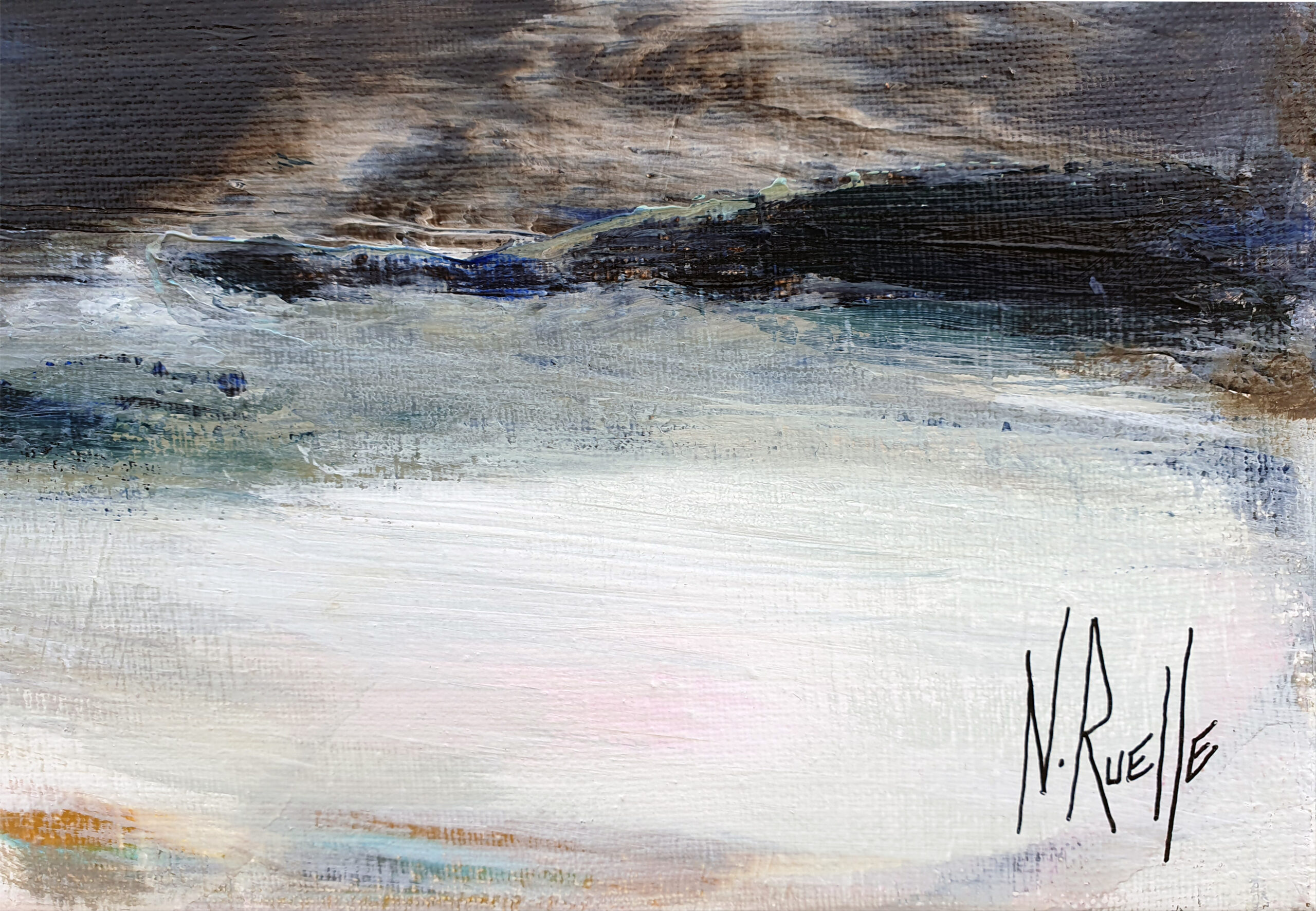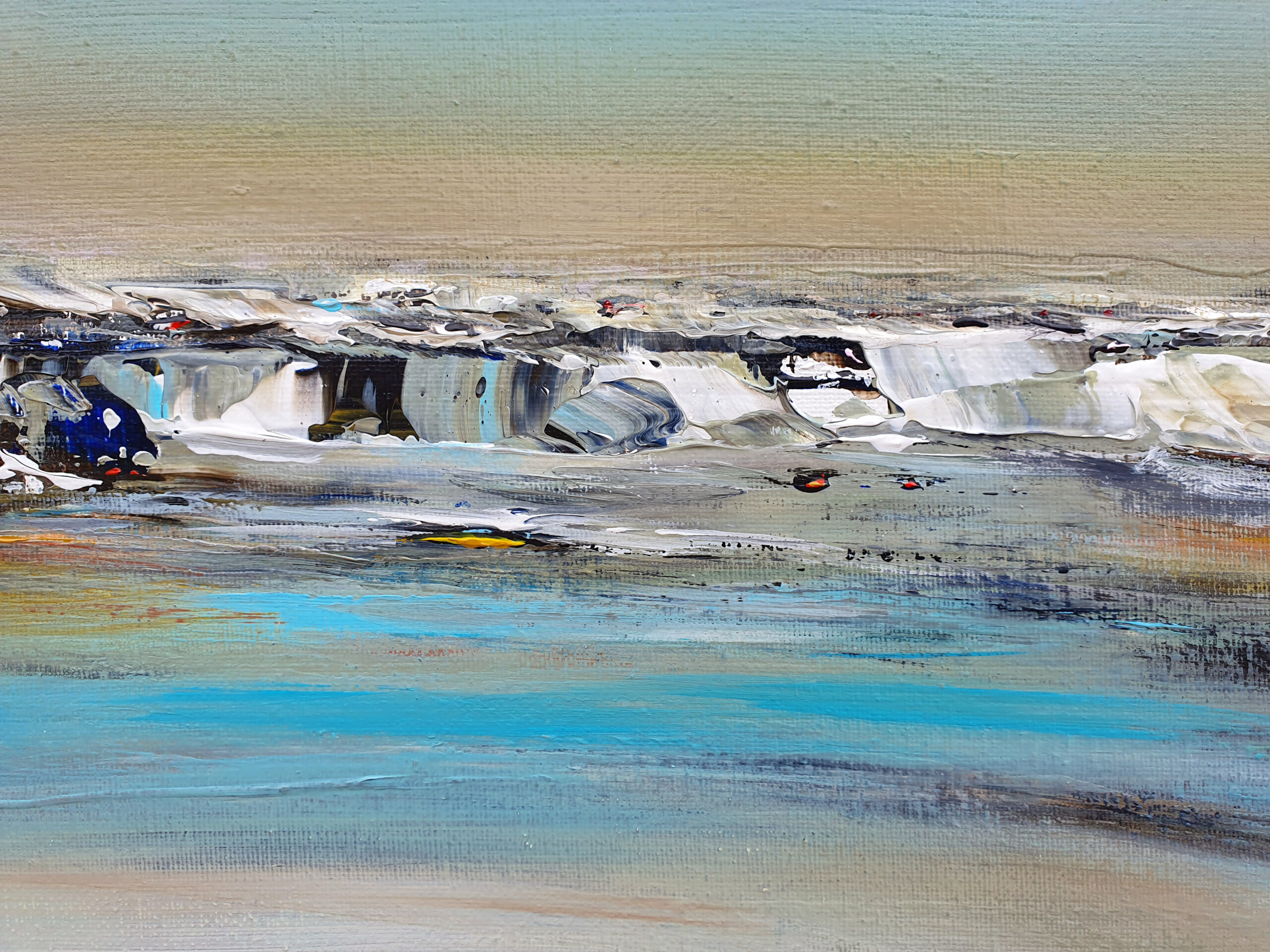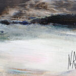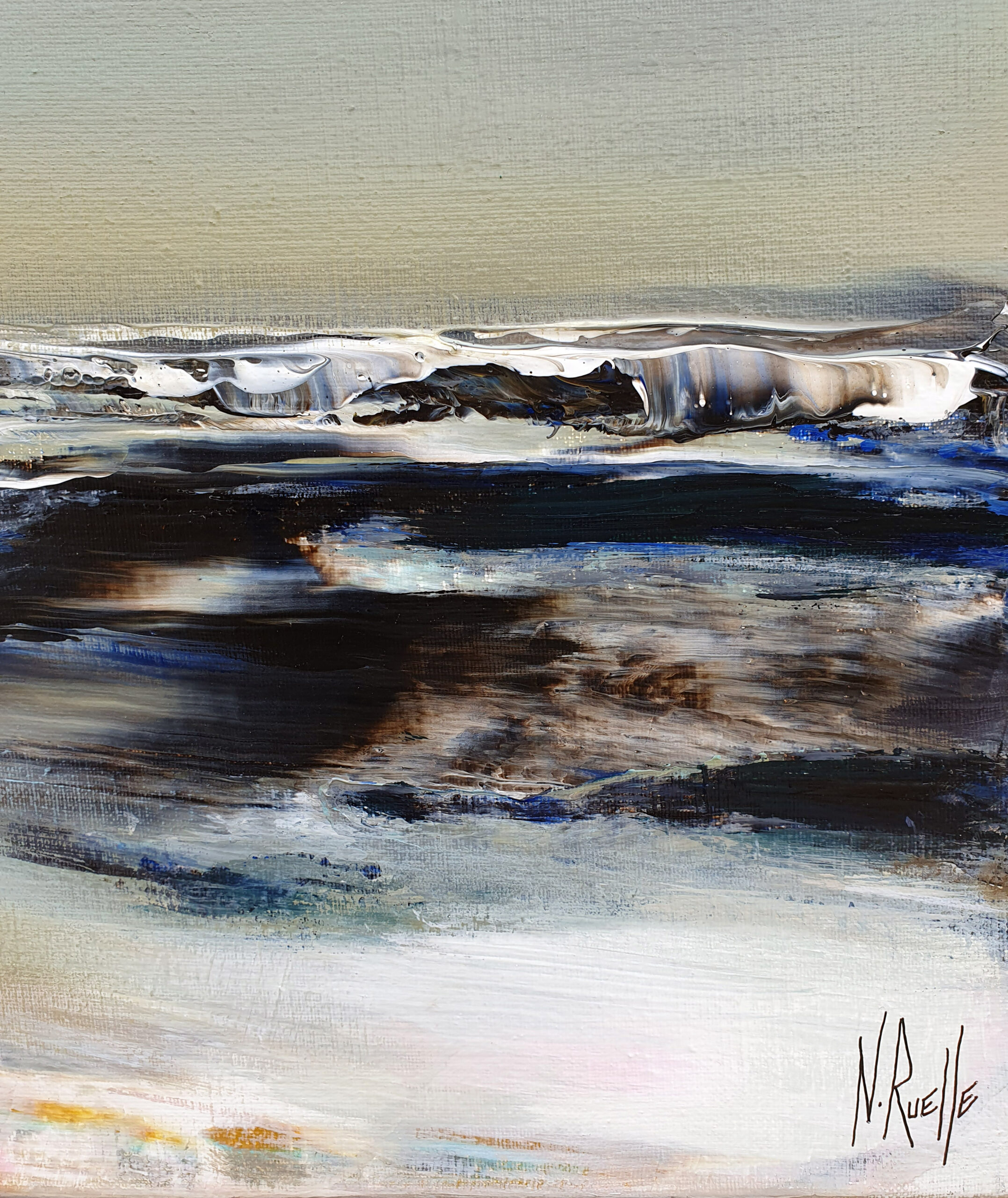 J’ai voulu saisir avec « Solstice » un moment de bascule, un passage temporel. Le ciel atmosphérique est irradié par une lumière dorée. Une bande de bleu turquoise électrique vient fendre la composition, apportant une clarté presque surnaturelle. Etymologiquement, le solstice représente le « soleil qui s’arrête ». La toile capture cet instant juste avant que le cycle ne reparte.