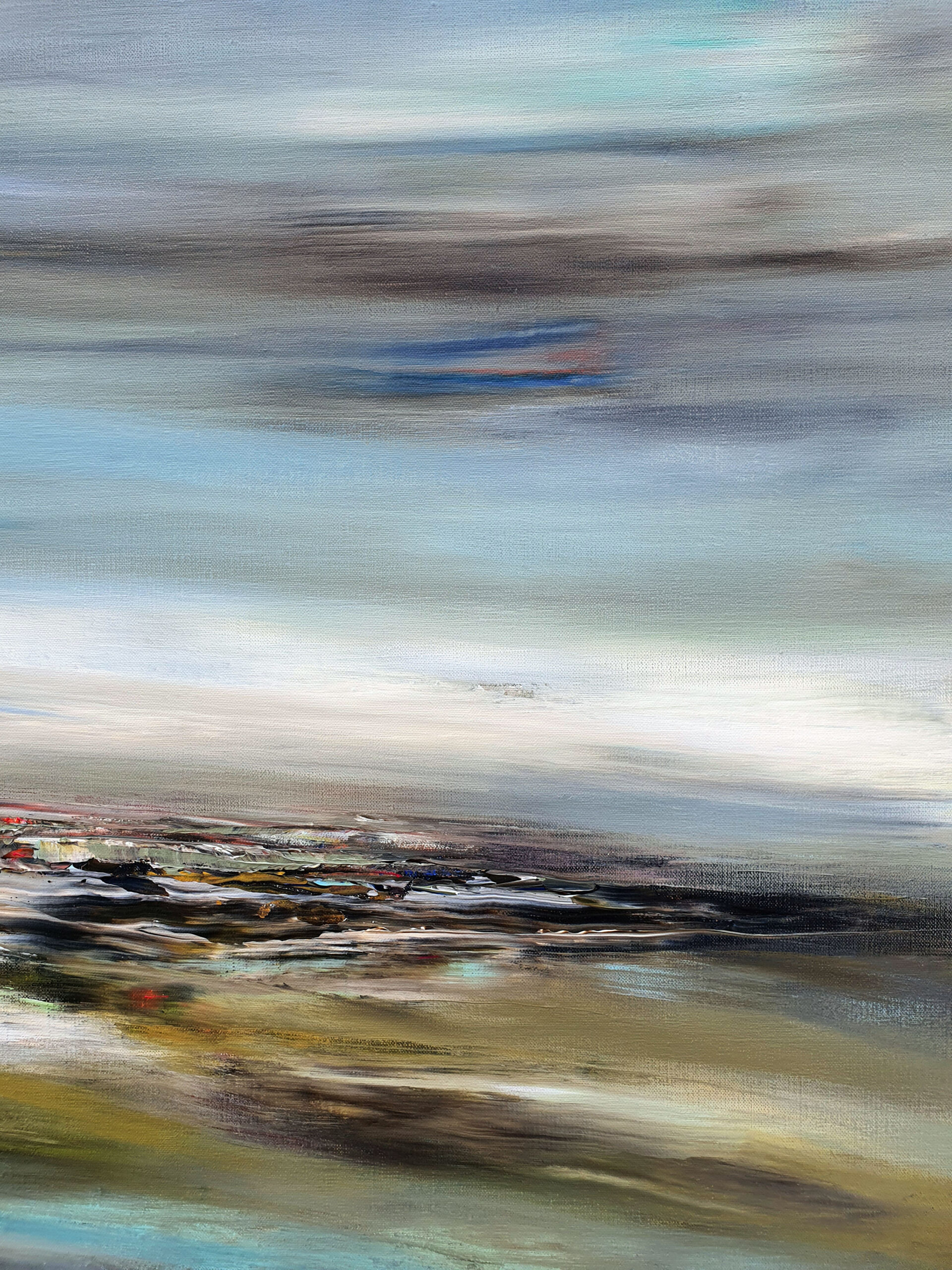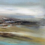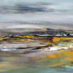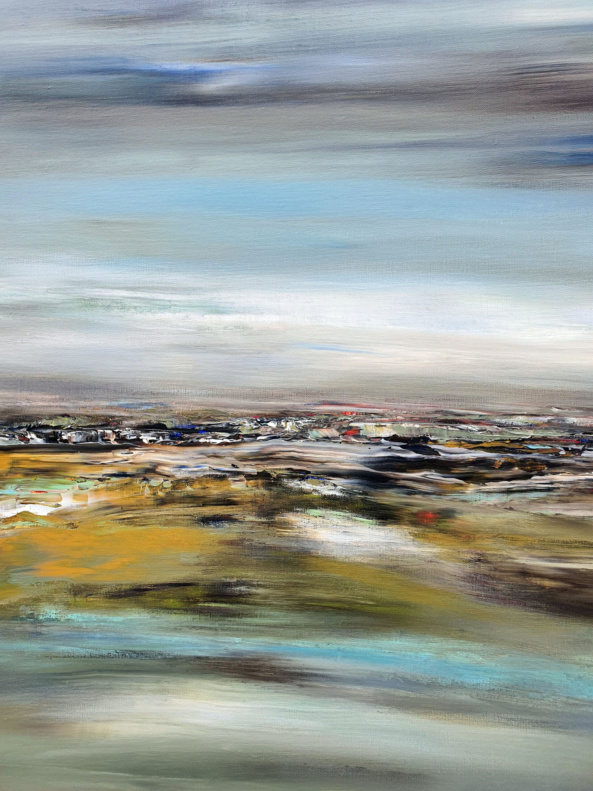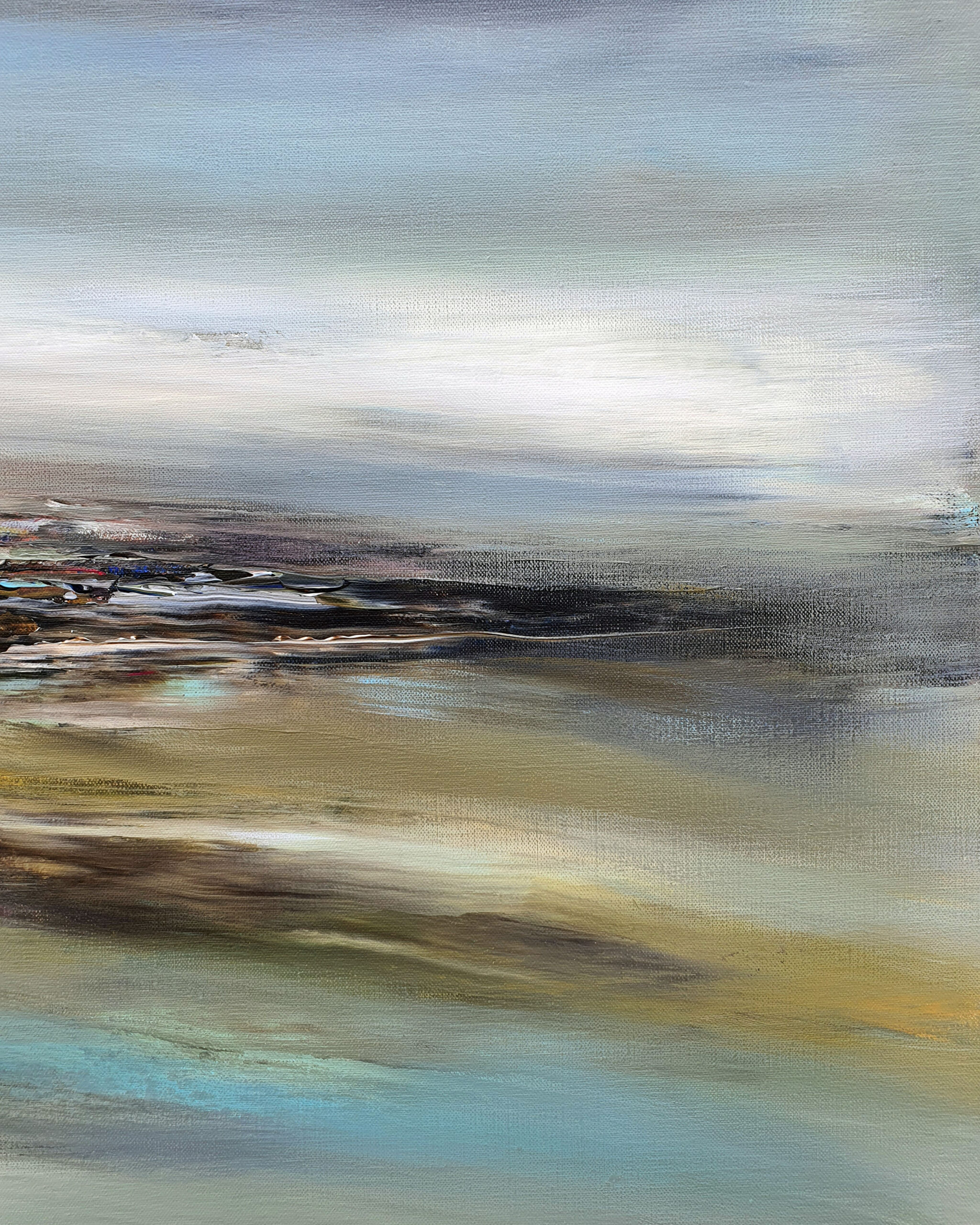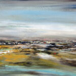 Avec « Souffle d’opale », j’ai voulu créer la rencontre poétique entre l’éther et la matière. La toile est une immersion au cœur d’un horizon où les frontières s’estompent. Des voiles de gris azuréen et de bleu acier dominent la composition. Sous ce ciel nuageux, l’horizon dense et texturé ancre la vision. Les bruns s’y mêlent aux ocres chaleureux, ponctués d’éclats de rouille et de verts profonds. La lumière blanche, intense et centrale, offre une trouée de clarté épurée. Ce jaillissement est le cœur battant de la toile, son équilibre lumineux.