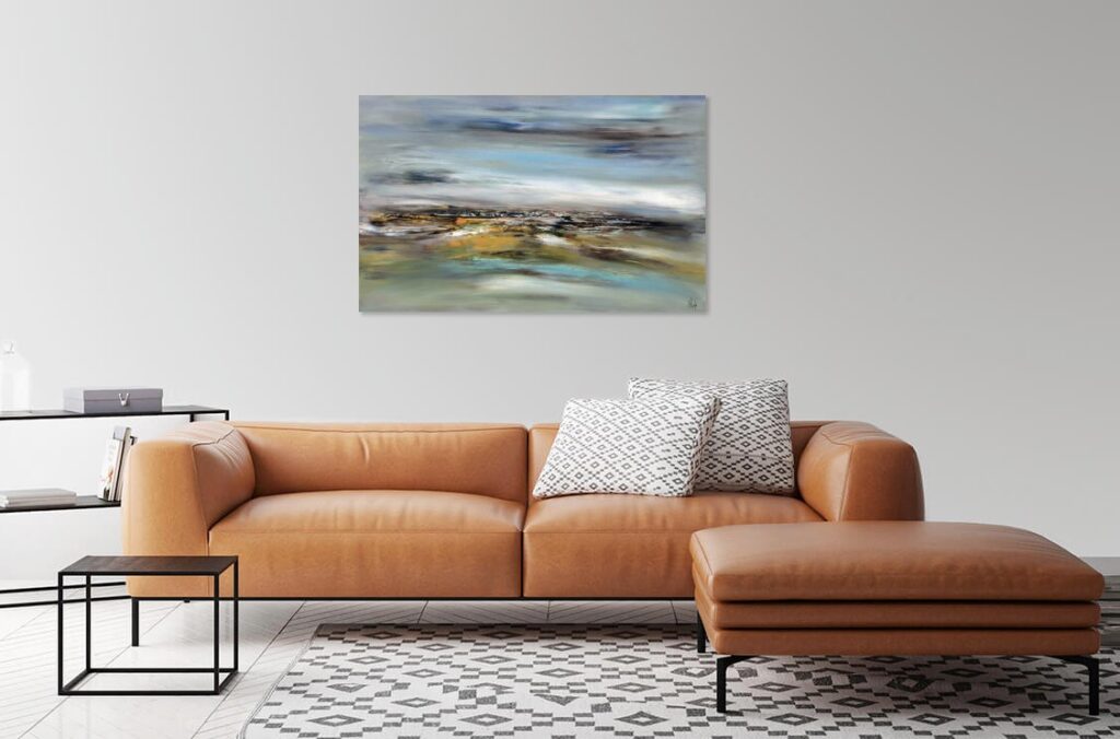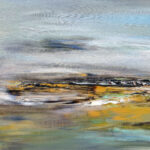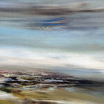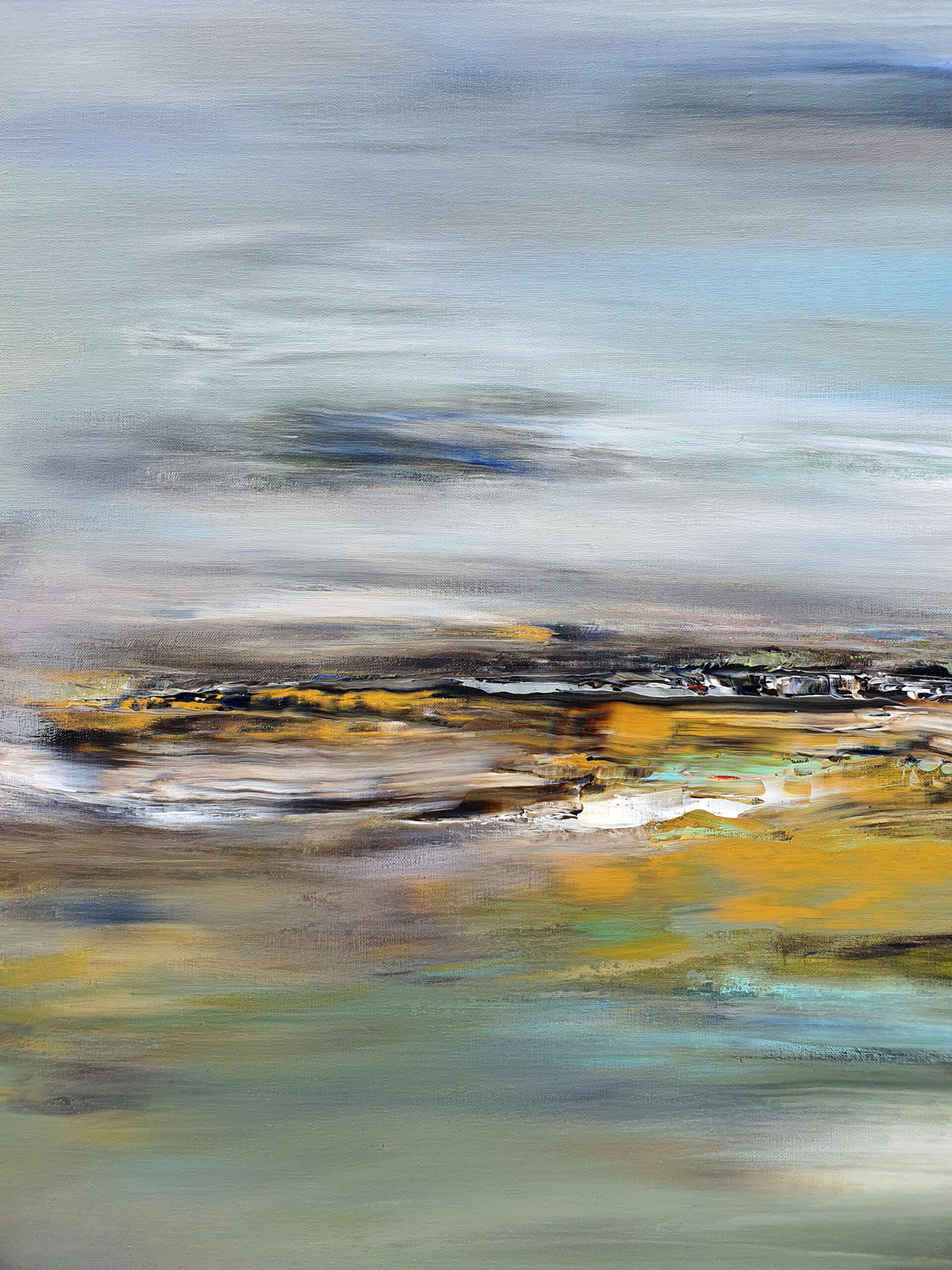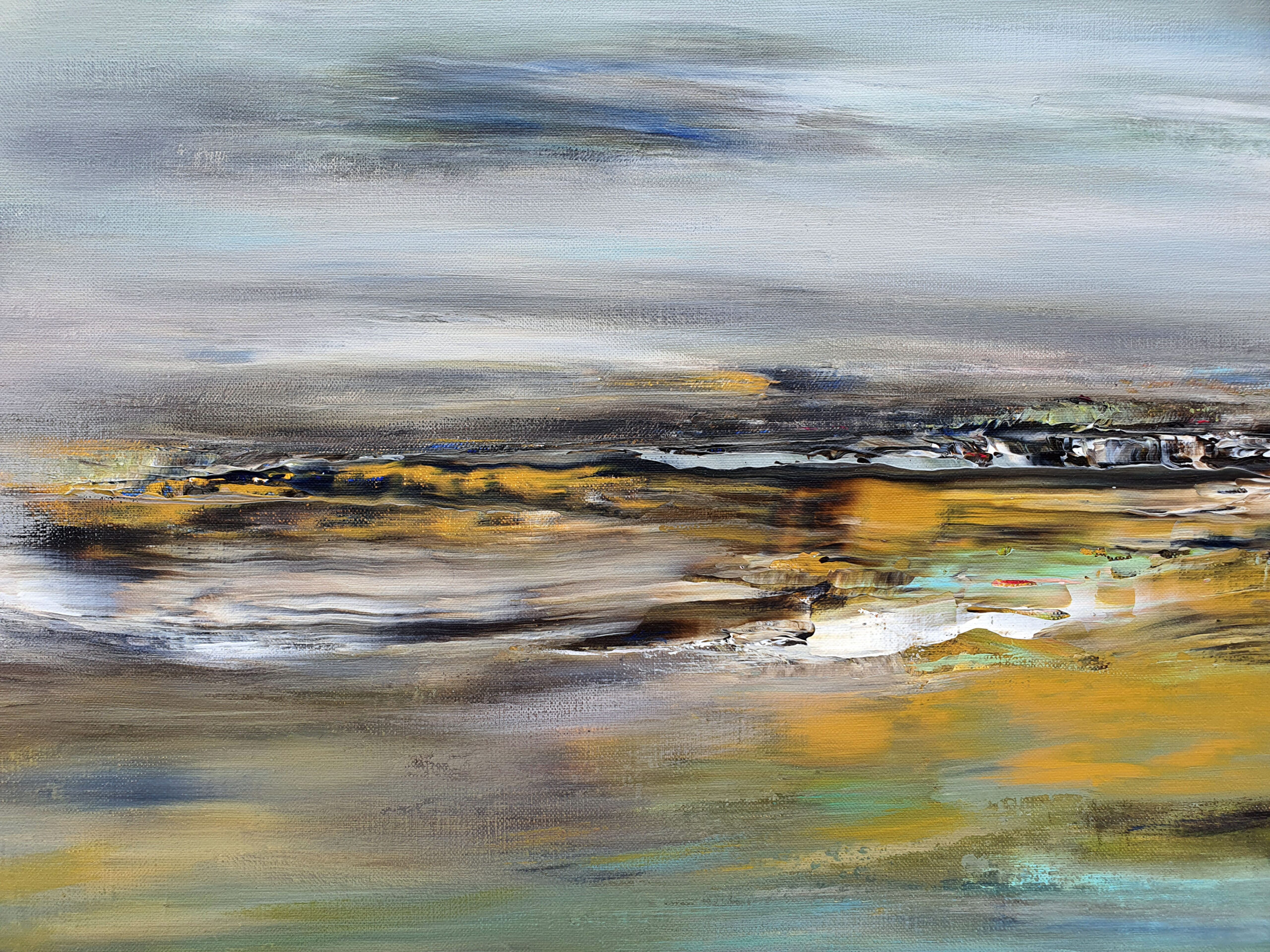 Avec « Souffle d’opale », j’ai voulu créer la rencontre poétique entre l’éther et la matière. La toile est une immersion au cœur d’un horizon où les frontières s’estompent. Des voiles de gris azuréen et de bleu acier dominent la composition. Sous ce ciel nuageux, l’horizon dense et texturé ancre la vision. Les bruns s’y mêlent aux ocres chaleureux, ponctués d’éclats de rouille et de verts profonds. La lumière blanche, intense et centrale, offre une trouée de clarté épurée. Ce jaillissement est le cœur battant de la toile, son équilibre lumineux.